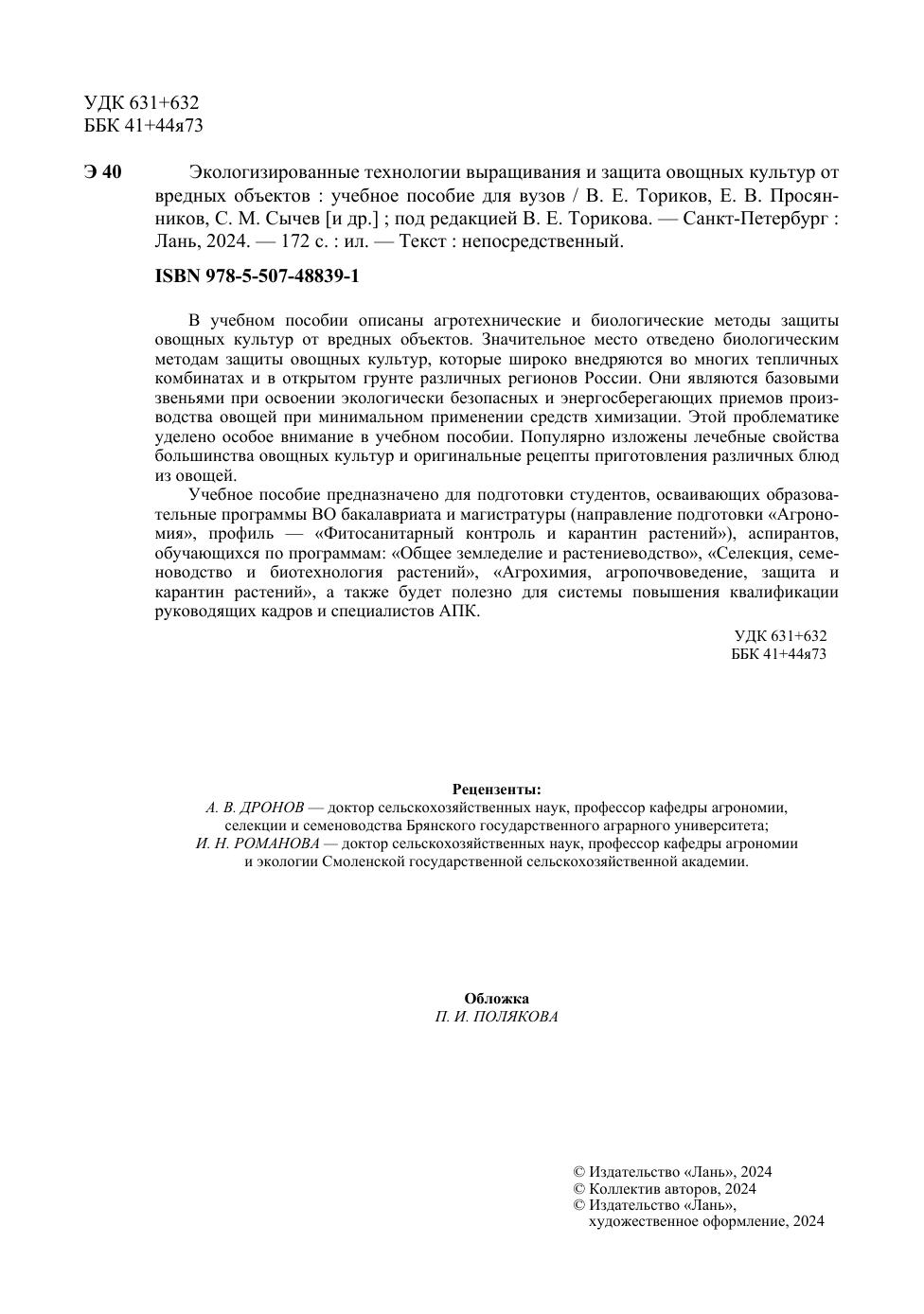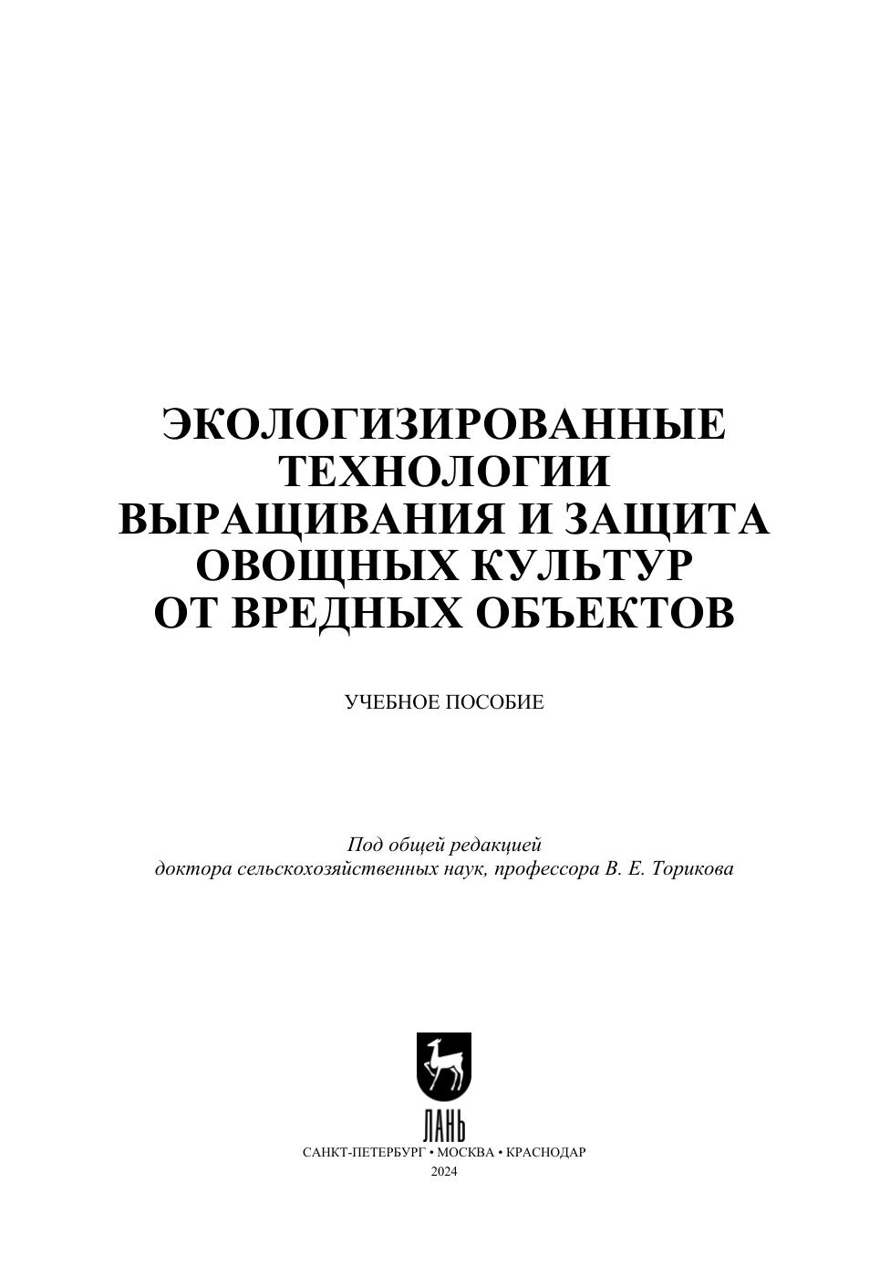 В учебном пособии описаны агротехнические и биологические методы защиты овощных культур от вредных объектов. Значительное место отведено биологическим методам защиты овощных культур, которые широко внедряются во многих тепличных комбинатах и в открытом грунте различных регионов России. Они являются базовыми звеньями при освоении экологически безопасных и энергосберегающих приемов производства овощей при минимальном применении средств химизации. Этой проблематике уделено особое внимание в учебном пособии. Популярно изложены лечебные свойства большинства овощных культур и оригинальные рецепты приготовления различных блюд из овощей. Учебное пособие предназначено для подготовки студентов, осваивающих образовательные программы ВО бакалавриата и магистратуры (направление подготовки «Агрономия», профиль — «Фитосанитарный контроль и карантин растений»), аспирантов, обучающихся по программам: «Общее земледелие и растениеводство», «Селекция, семеноводство и биотехнология растений», «Агрохимия, агропочвоведение, защита и карантин растений», а также будет полезно для системы повышения квалификации руководящих кадров и специалистов АПК.