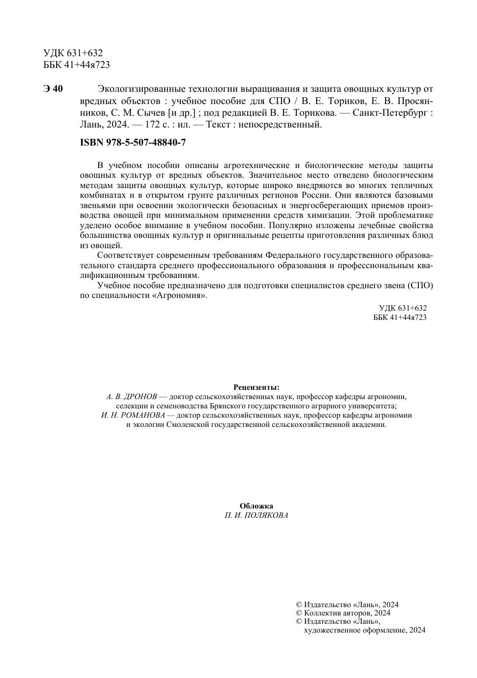 В учебном пособии описаны агротехнические и биологические методы защиты овощных культур от вредных объектов. Значительное место отведено биологическим методам защиты овощных культур, которые широко внедряются во многих тепличных комбинатах и в открытом грунте различных регионов России. Они являются базовыми звеньями при освоении экологически безопасных и энергосберегающих приемов производства овощей при минимальном применении средств химизации. Этой проблематике уделено особое внимание в учебном пособии. Популярно изложены лечебные свойства большинства овощных культур и оригинальные рецепты приготовления различных блюд из овощей. Соответствует современным требованиям Федерального государственного образовательного стандарта среднего профессионального образования и профессиональным квалификационным требованиям. Учебное пособие предназначено для подготовки специалистов среднего звена (СПО) по специальности «Агрономия».
