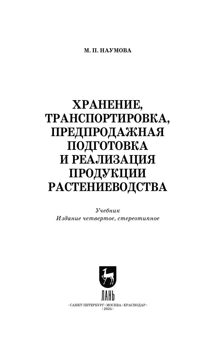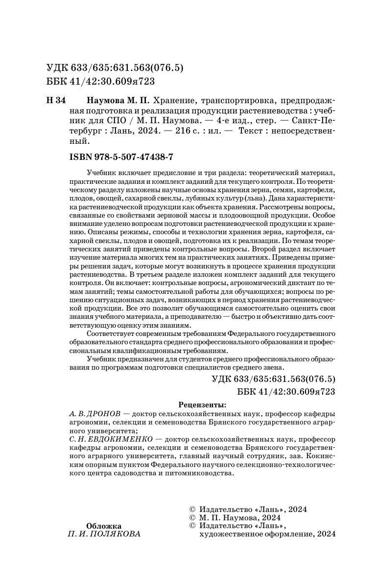 Учебник включает предисловие и три раздела: теоретический материал, практические задания и комплект заданий для текущего контроля. По теоретическому разделу изложены научные основы хранения зерна, семян, картофеля, плодов, овощей, сахарной свеклы, лубяных культур (льна). Дана характеристика растениеводческой продукции как объекта хранения. Рассмотрены вопросы, связанные со свойствами зерновой массы и плодоовощной продукции. Особое внимание уделено вопросам подготовки растениеводческой продукции к хранению. Описаны режимы, способы и технологии хранения зерна, картофеля, сахарной свеклы, плодов и овощей, подготовка их к реализации. По темам теоретических занятий приведены контрольные вопросы. Второй раздел включает изучение материала многих тем на практических занятиях. Приведены примеры решения задач, которые могут возникнуть в процессе хранения продукции растениеводства. В третьем разделе изложен комплект заданий для текущего контроля. Он включает: контрольные вопросы, агрономический диктант по темам занятий, темы самостоятельной работы для обучающихся, вопросы по решению ситуационных задач, возникающих в период хранения растениеводческой продукции. Все это позволит обучающимся самостоятельно оценить свои знания учебного материала, а преподавателю — быстро и объективно дать соответствующую оценку этим знаниям. Соответствует современным требованиям Федерального государственного образовательного стандарта среднего профессионального образования и профессиональным квалификационным требованиям. Учебник предназначен для студентов среднего профессионального образования по программам подготовки специалистов среднего звена.