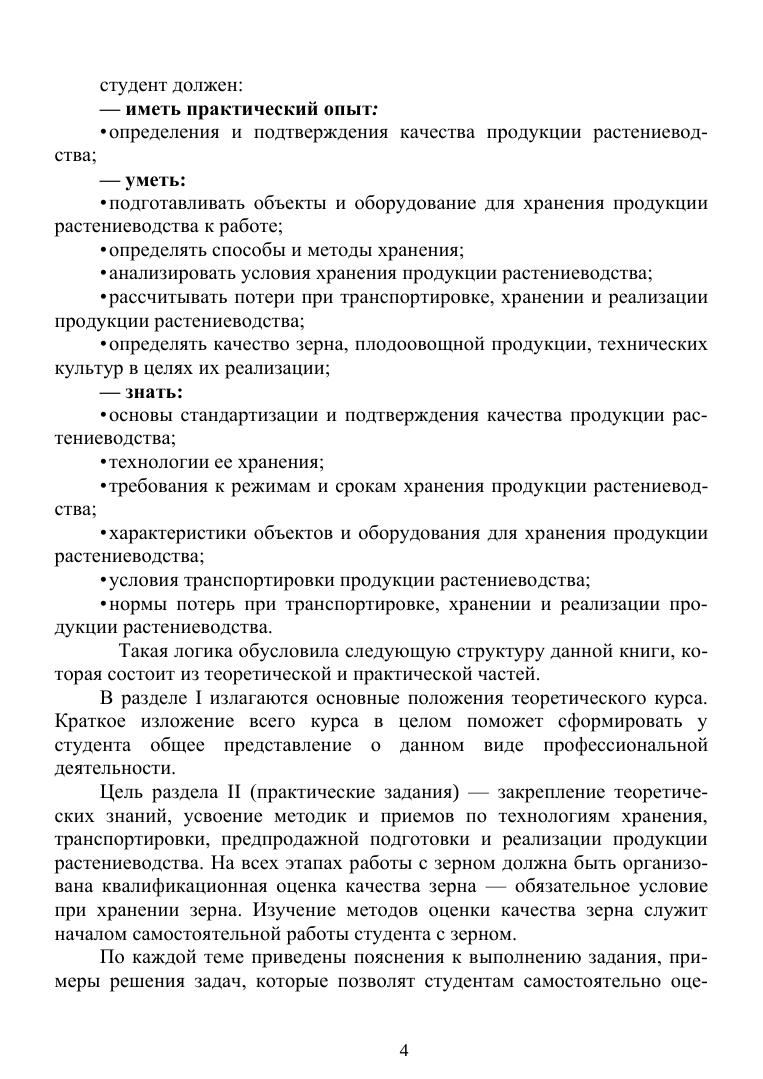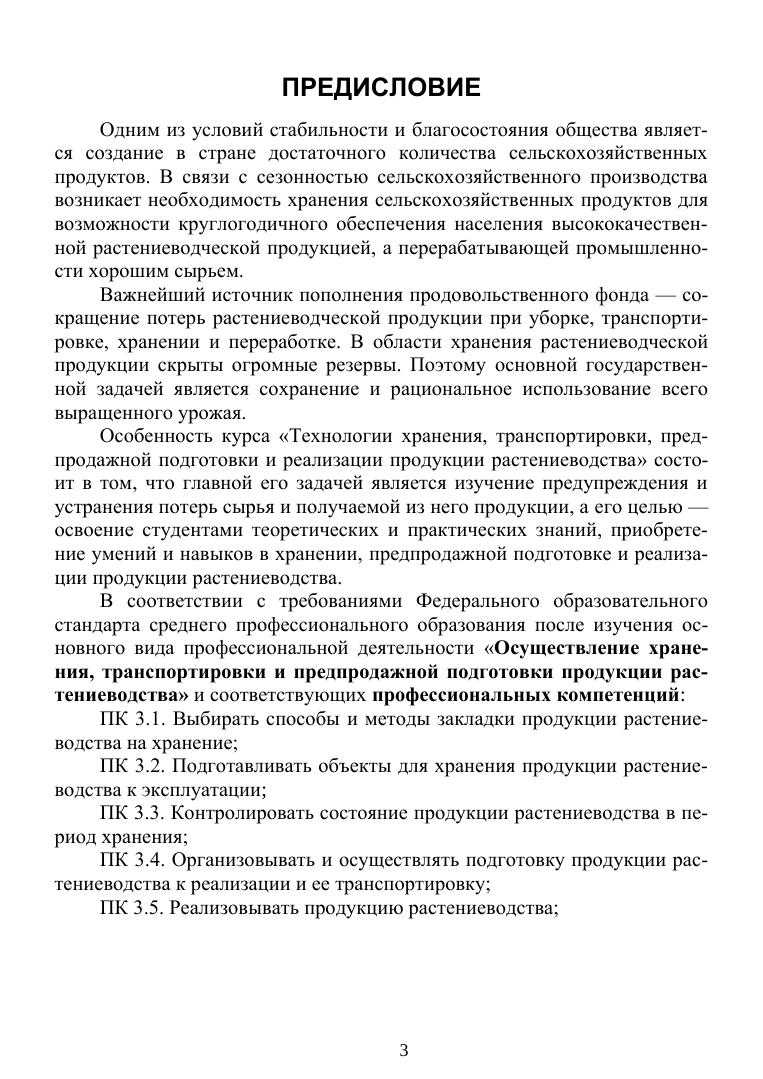 Учебник включает предисловие и три раздела: теоретический материал, практические задания и комплект заданий для текущего контроля. По теоретическому разделу изложены научные основы хранения зерна, семян, картофеля, плодов, овощей, сахарной свеклы, лубяных культур (льна). Дана характеристика растениеводческой продукции как объекта хранения. Рассмотрены вопросы, связанные со свойствами зерновой массы и плодоовощной продукции. Особое внимание уделено вопросам подготовки растениеводческой продукции к хранению. Описаны режимы, способы и технологии хранения зерна, картофеля, сахарной свеклы, плодов и овощей, подготовка их к реализации. По темам теоретических занятий приведены контрольные вопросы. Второй раздел включает изучение материала многих тем на практических занятиях. Приведены примеры решения задач, которые могут возникнуть в процессе хранения продукции растениеводства. В третьем разделе изложен комплект заданий для текущего контроля. Он включает: контрольные вопросы, агрономический диктант по темам занятий, темы самостоятельной работы для обучающихся, вопросы по решению ситуационных задач, возникающих в период хранения растениеводческой продукции. Все это позволит обучающимся самостоятельно оценить свои знания учебного материала, а преподавателю — быстро и объективно дать соответствующую оценку этим знаниям. Соответствует современным требованиям Федерального государственного образовательного стандарта среднего профессионального образования и профессиональным квалификационным требованиям. Учебник предназначен для студентов среднего профессионального образования по программам подготовки специалистов среднего звена.