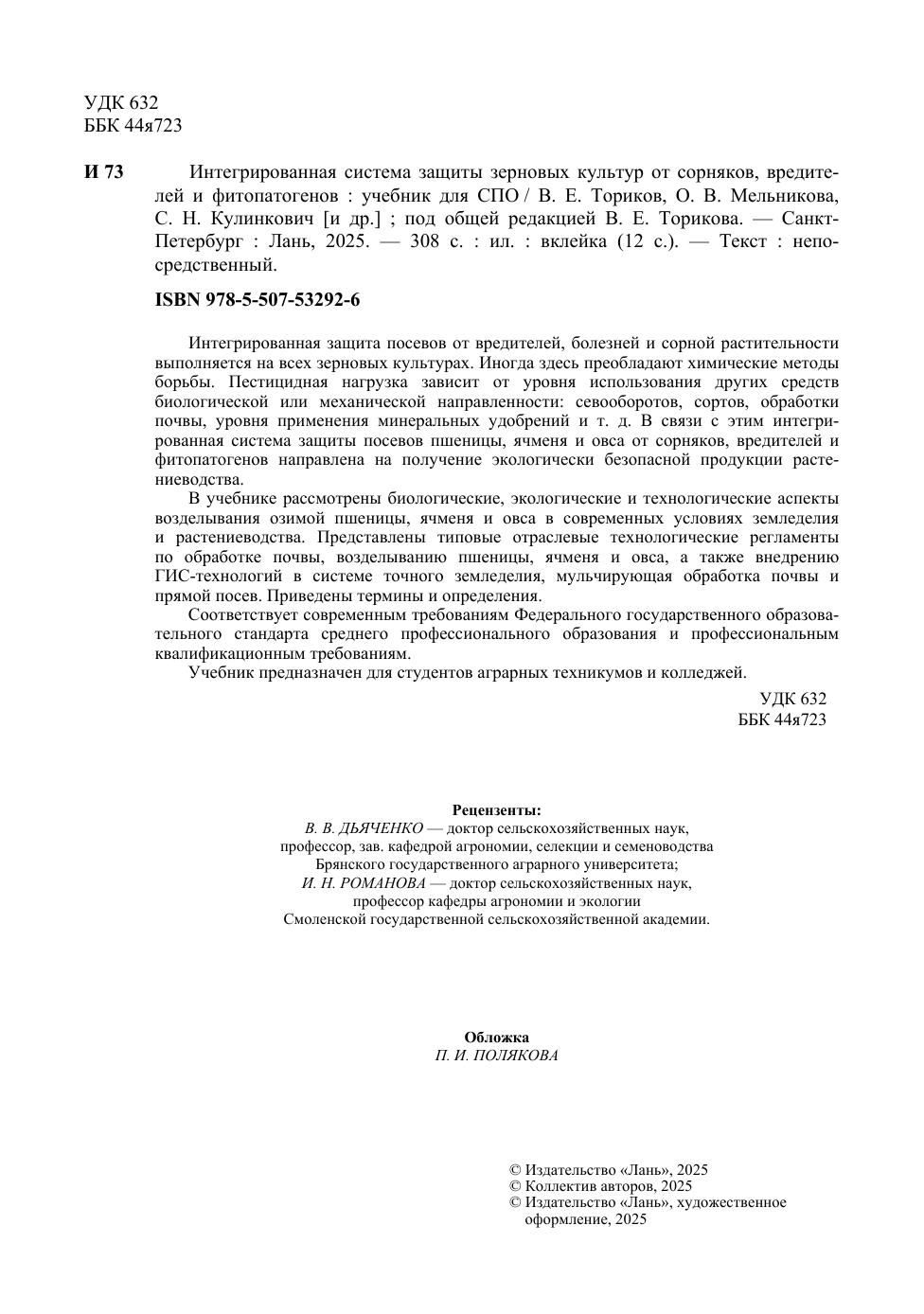 Интегрированная защита посевов от вредителей, болезней и сорной растительности выполняется на всех зерновых культурах. Иногда здесь преобладают химические методы борьбы. Пестицидная нагрузка зависит от уровня использования других средств биологической или механической направленности: севооборотов, сортов, обработки почвы, уровня применения минеральных удобрений и т. д. В связи с этим интегрированная система защиты посевов пшеницы, ячменя и овса от сорняков, вредителей и фитопатогенов направлена на получение экологически безопасной продукции растениеводства. В учебнике рассмотрены биологические, экологические и технологические аспекты возделывания озимой пшеницы, ячменя и овса в современных условиях земледелия и растениеводства. Представлены типовые отраслевые технологические регламенты по обработке почвы, возделыванию пшеницы, ячменя и овса, а также внедрению ГИС-технологий в системе точного земледелия, мульчирующая обработка почвы и прямой посев. Приведены термины и определения. Соответствует современным требованиям Федерального государственного образовательного стандарта среднего профессионального образования и профессиональным квалификационным требованиям. Учебник предназначен для студентов аграрных техникумов и колледжей.