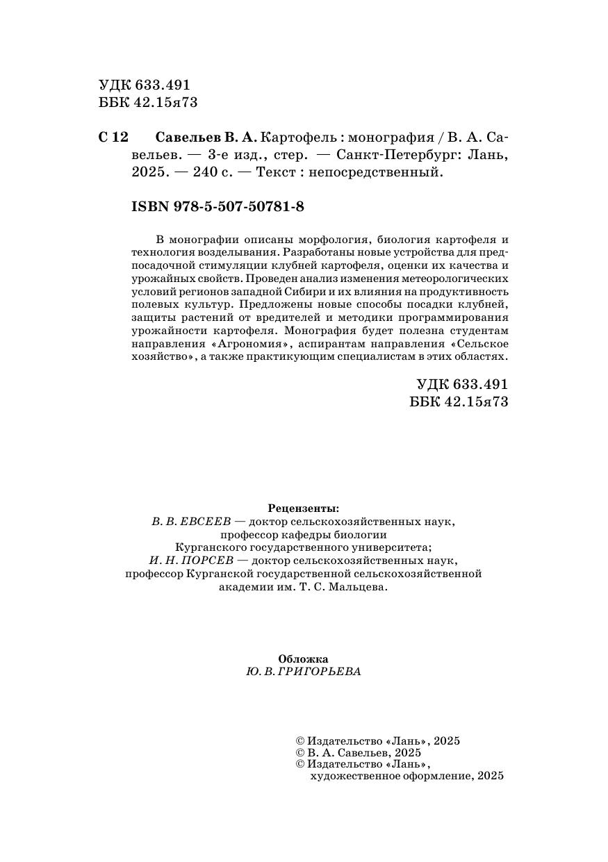 В монографии описаны морфология, биология картофеля и технология возделывания. разработаны новые устройства для предпосадочной стимуляции клубней картофеля, оценки их качества и урожайных свойств. Проведен анализ изменения метеорологических условий регионов западной Сибири и их влияния на продуктивность полевых культупр. Предложены новые способы посадки клубней, защиты растений от вредителей и методики программирования урожайности картофеля. Монография будет полезна студентам направления "Агрономия", аспирантам направления "Сельское хозяйство", а также практикующим специалистам в этих областях.