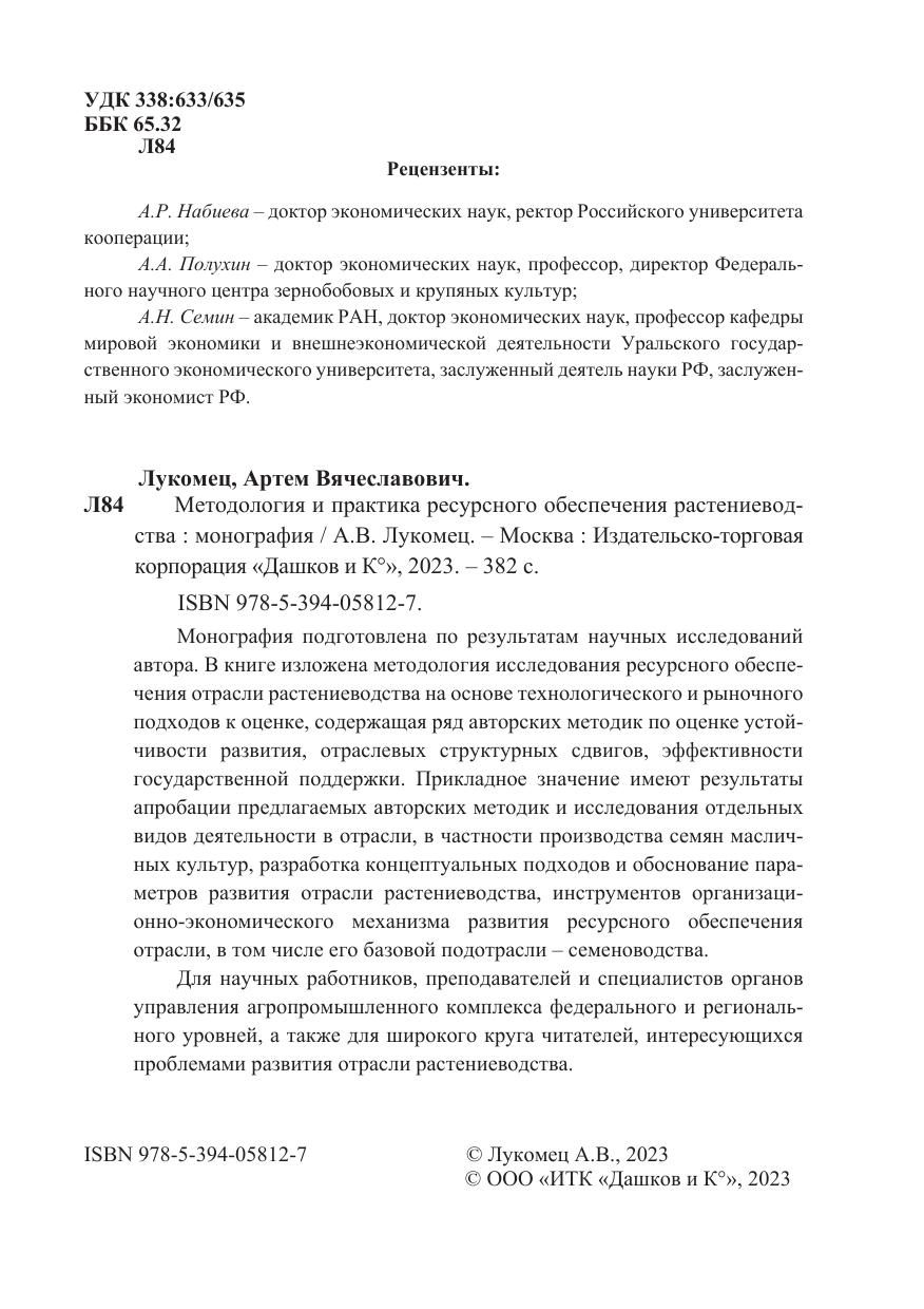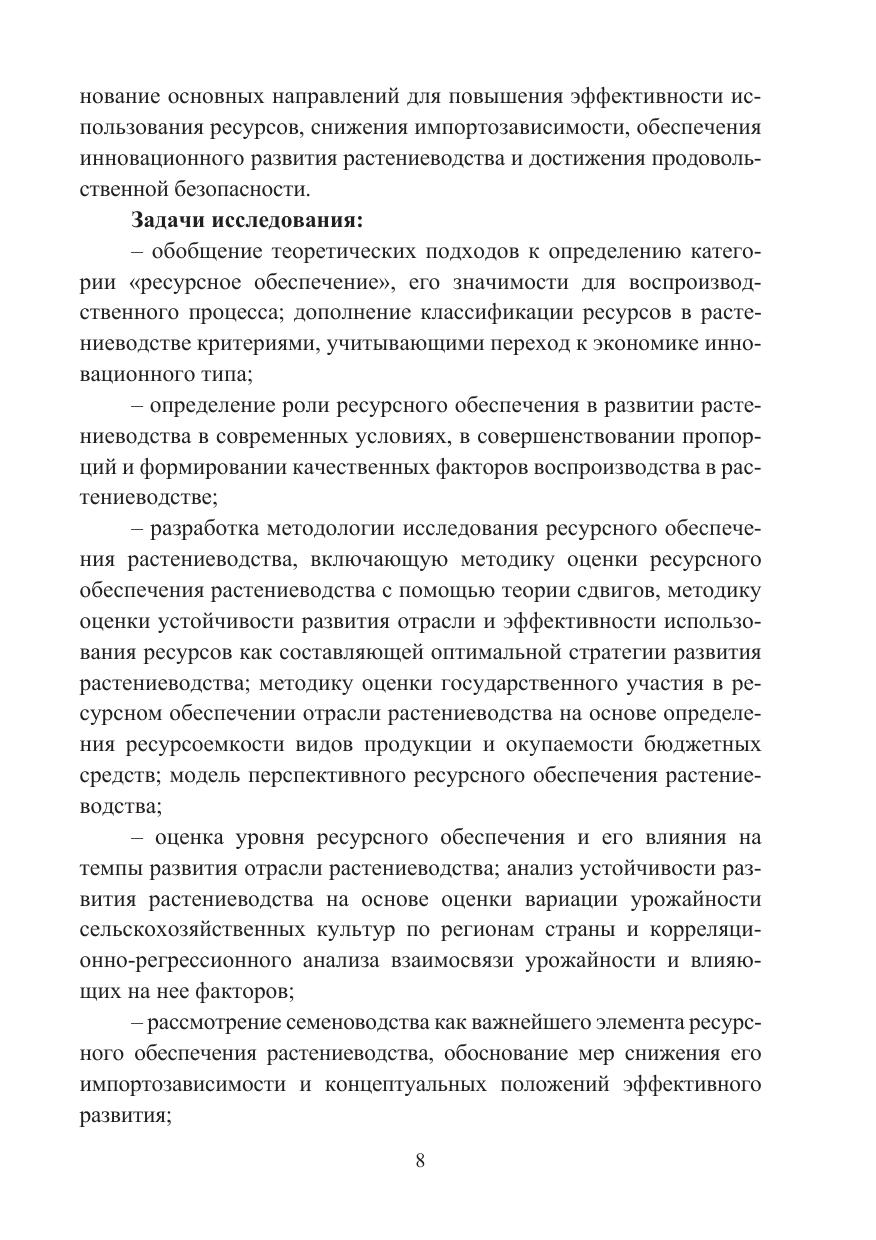 Монография подготовлена по результатам научных исследований автора. В книге изложена методология исследования ресурсного обеспечения отрасли растениеводства на основе технологического и рыночного подходов к оценке, содержащая ряд авторских методик по оценке устойчивости развития, отраслевых структурных сдвигов, эффективности государственной поддержки. Прикладное значение имеют результаты апробации предлагаемых авторских методик и исследования отдельных видов деятельности в отрасли, в частности производства семян масличных культур, разработка концептуальных подходов и обоснование параметров развития отрасли растениеводства, инструментов организационно-экономического механизма развития ресурсного обеспечения отрасли, в том числе его базовой подотрасли – семеноводства.
