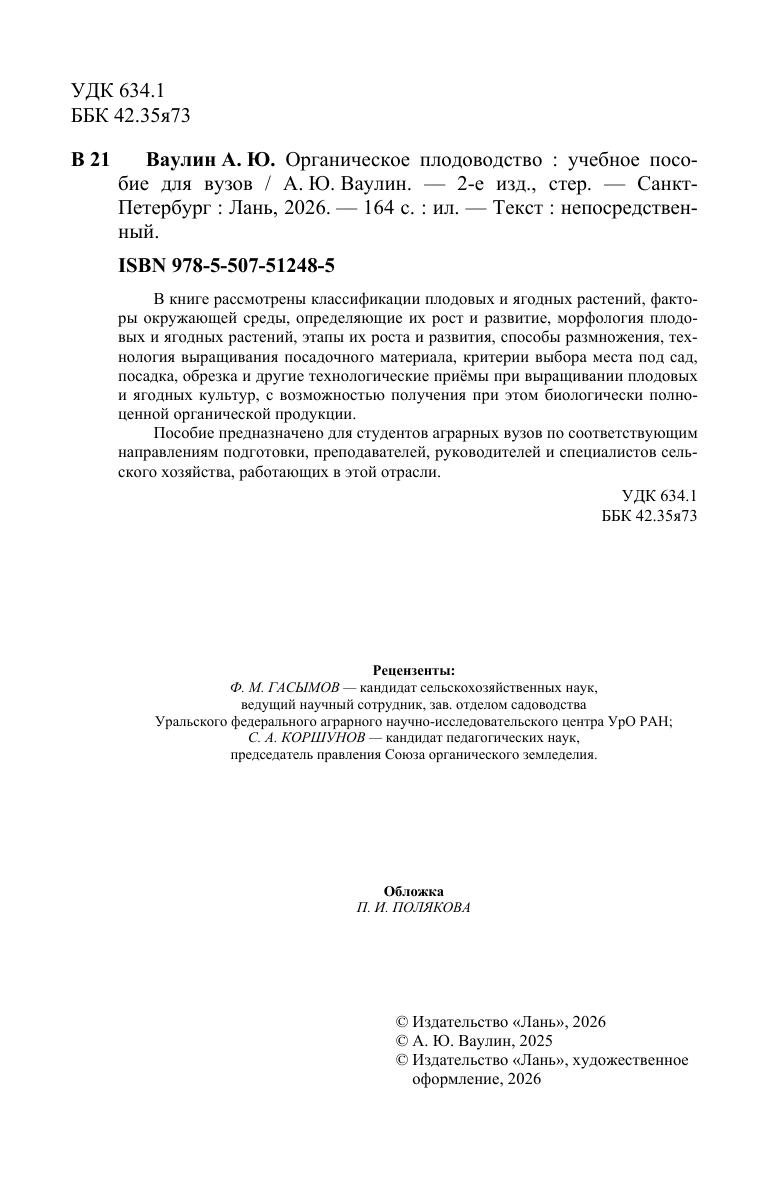 В книге рассмотрены классификации плодовых и ягодных растений, факторы окружающей среды, определяющие их рост и развитие, морфология плодовых и ягодных растений, этапы их роста и развития, способы размножения, технология выращивания посадочного материала, критерии выбора места под сад, посадка, обрезка и другие технологические приёмы при выращивании плодовых и ягодных культур, с возможностью получения при этом биологически полноценной органической продукции. Пособие предназначено для студентов аграрных вузов по соответствующим направлениям подготовки, преподавателей, руководителей и специалистов сельского хозяйства, работающих в этой отрасли.