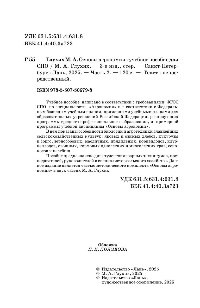 Учебное пособие написано в соответствии с требованиями ФГОС СПО по специальности «Агрономия» и в соответствии с федеральным базисным учебным планом, примерными учебными планами для образовательных учреждений Российской Федерации, реализующих программы среднего профессионального образования, и примерной программы учебной дисциплины «Основы агрономии». В нем показаны особенности биологии и агротехники главнейших сельскохозяйственных культур: яровых и озимых хлебов, кукурузы и сорго, зернобобовых, масличных, прядильных, корнеплодов, клубнеплодов, овощных, кормовых однолетних и многолетних трав, сенокосов и пастбищ. Пособие предназначено для студентов аграрных техникумов, преподавателей, руководителей и специалистов сельского хозяйства. Данное издание является частью методического комплекта «Основы агрономии» в двух частях М. А. Глухих.