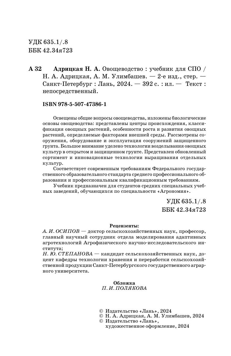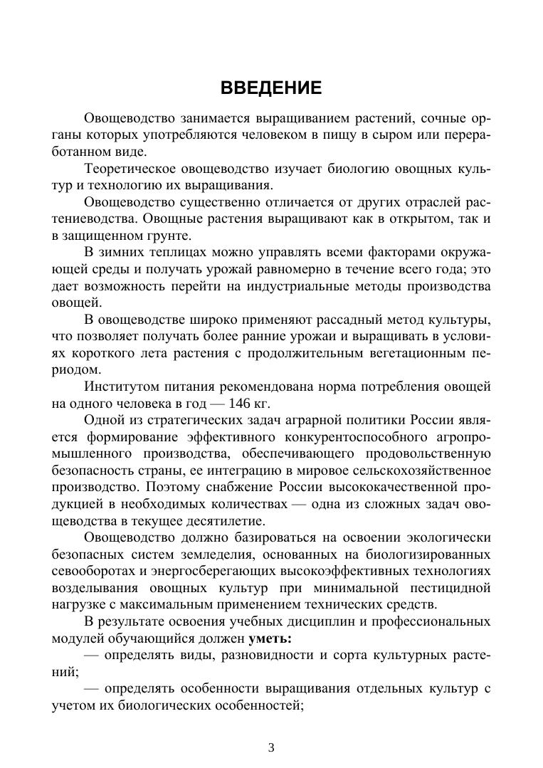 Освещены общие вопросы овощеводства, изложены биологические основы овощеводства: представлены центры происхождения, классификация овощных растений, особенности роста и развития овощных растений, определяемые факторами внешней среды. Рассмотрены сооружения, оборудование и эксплуатация сооружений защищенного грунта. Большое внимание уделено технологии возделывания овощных культур в открытом и защищенном грунте. Представлен обновленный сортимент и инновационные технологии выращивания отдельных культур. Соответствует современным требованиям Федерального государственного образовательного стандарта среднего профессионального образования и профессиональным квалификационным требованиям. Учебное пособие предназначено для студентов средних специальных учебных заведений, обучающихся по специальности «Агрономия».