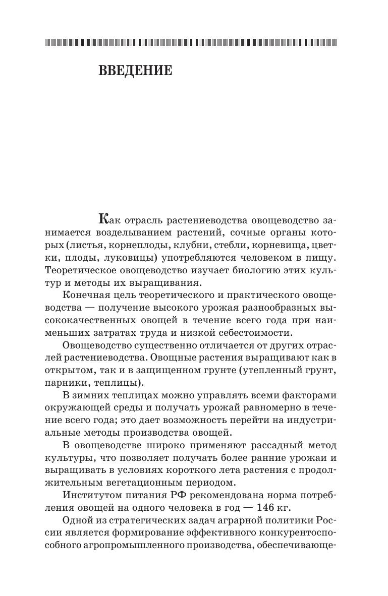 Освещены общие вопросы овощеводства, подробно изложены биологические основы овощеводства: представлены центры происхождения, морфологические особенности и существующие классификации овощных растений. Раскрыты особенности роста и развития овощных растений, определяемые факторами внешней среды. Рассмотрены сооружения, оборудование и эксплуатация сооружений защищенного грунта. Большое внимание уделено технологии возделывания овощных культур в открытом и защищенном грунте. Представлен обновленный сортимент и инновационные технологии выращивания отдельных культур. Учебное пособие предназначено для студентов высших учебных заведений, обучающихся по направлениям подготовки «Садоводство», «Агрономия», «Агрохимия и агропочвоведение».