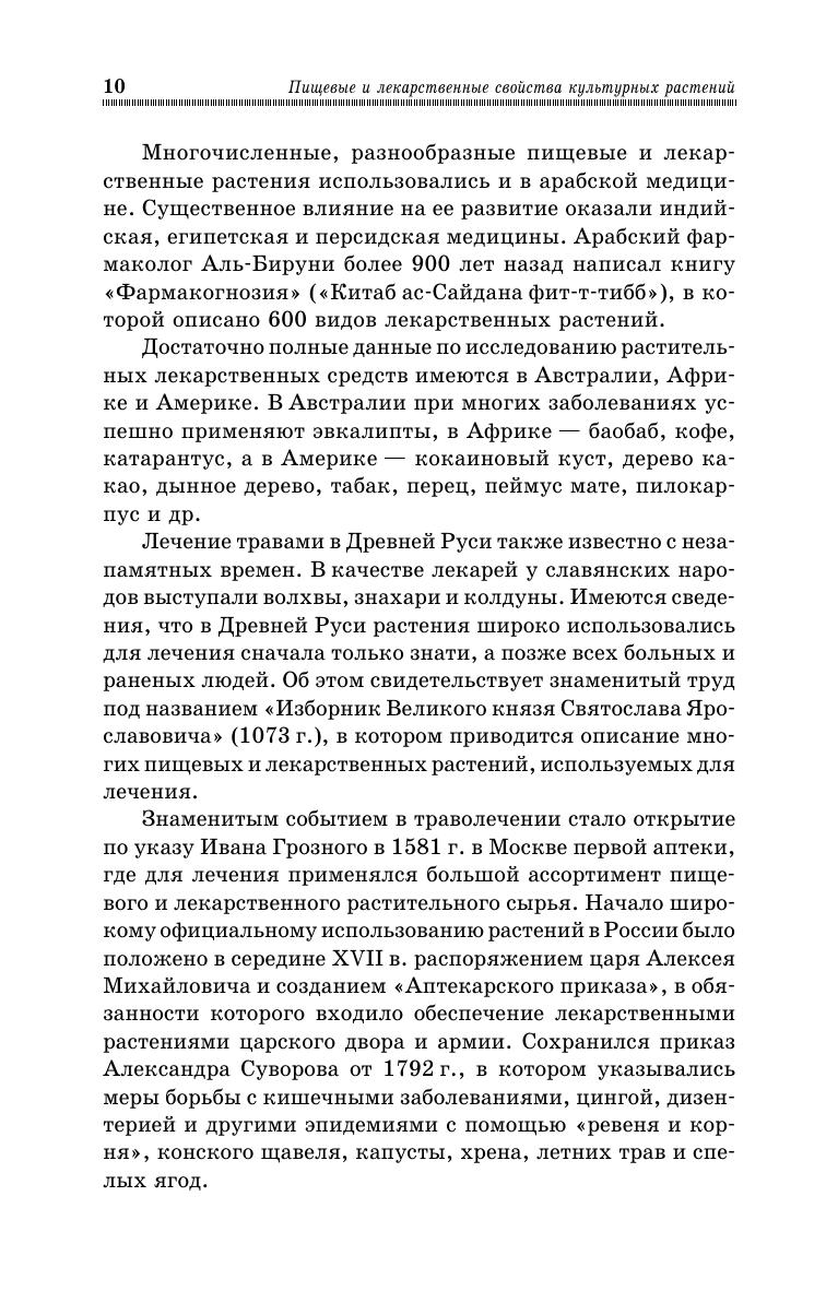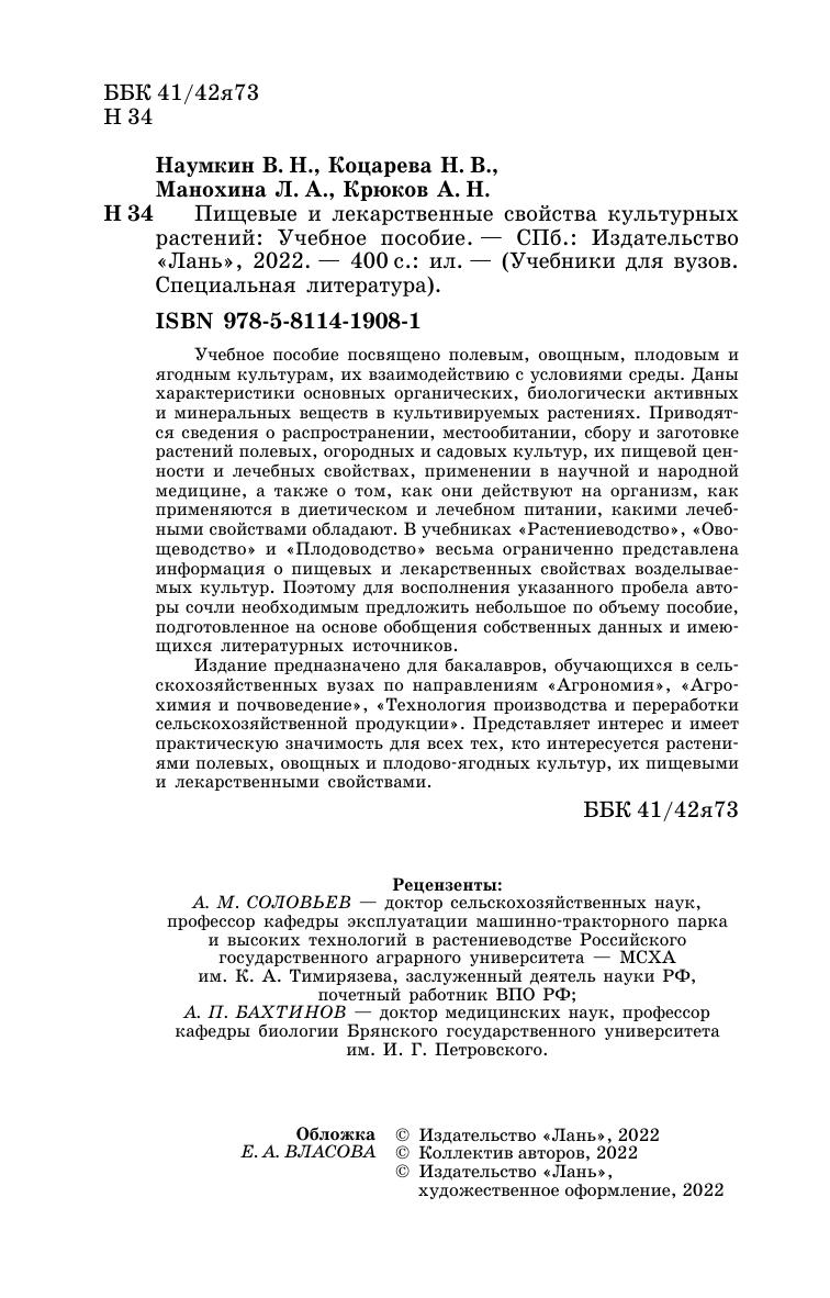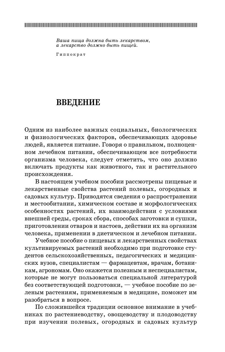 Учебное пособие посвящено полевым, овощным, плодовым и ягодным культурам, их взаимодействию с условиями среды. Даны характеристики основных органических, биологически активных и минеральных веществ в культивируемых растениях. Приводятся сведения о распространении, местообитании, сбору и заготовке растений полевых, огородных и садовых культур, их пищевой ценности и лечебных свойствах, применении в научной и народной медицине, а также о том, как они действуют на организм, как применяются в диетическом и лечебном питании, какими лечебными свойствами обладают. В учебниках «Растениеводство», «Овощеводство» и «Плодоводство» весьма ограниченно представлена информация о пищевых и лекарственных свойствах возделываемых культур. Поэтому для восполнения указанного пробела авторы сочли необходимым предложить небольшое по объему пособие, подготовленное на основе обобщения собственных данных и имеющихся литературных источников. Издание предназначено для бакалавров, обучающихся в сельскохозяйственных вузах по направлениям «Агрономия», «Агрохимия и почвоведение», «Овощеводство и плодоводство», «Технология производства и переработки сельскохозяйственной продукции». Представляет интерес и имеет практическую значимость для всех тех, кто интересуется растениями полевых, овощных и плодово-ягодных культур, их пищевыми и лекарственными свойствами.