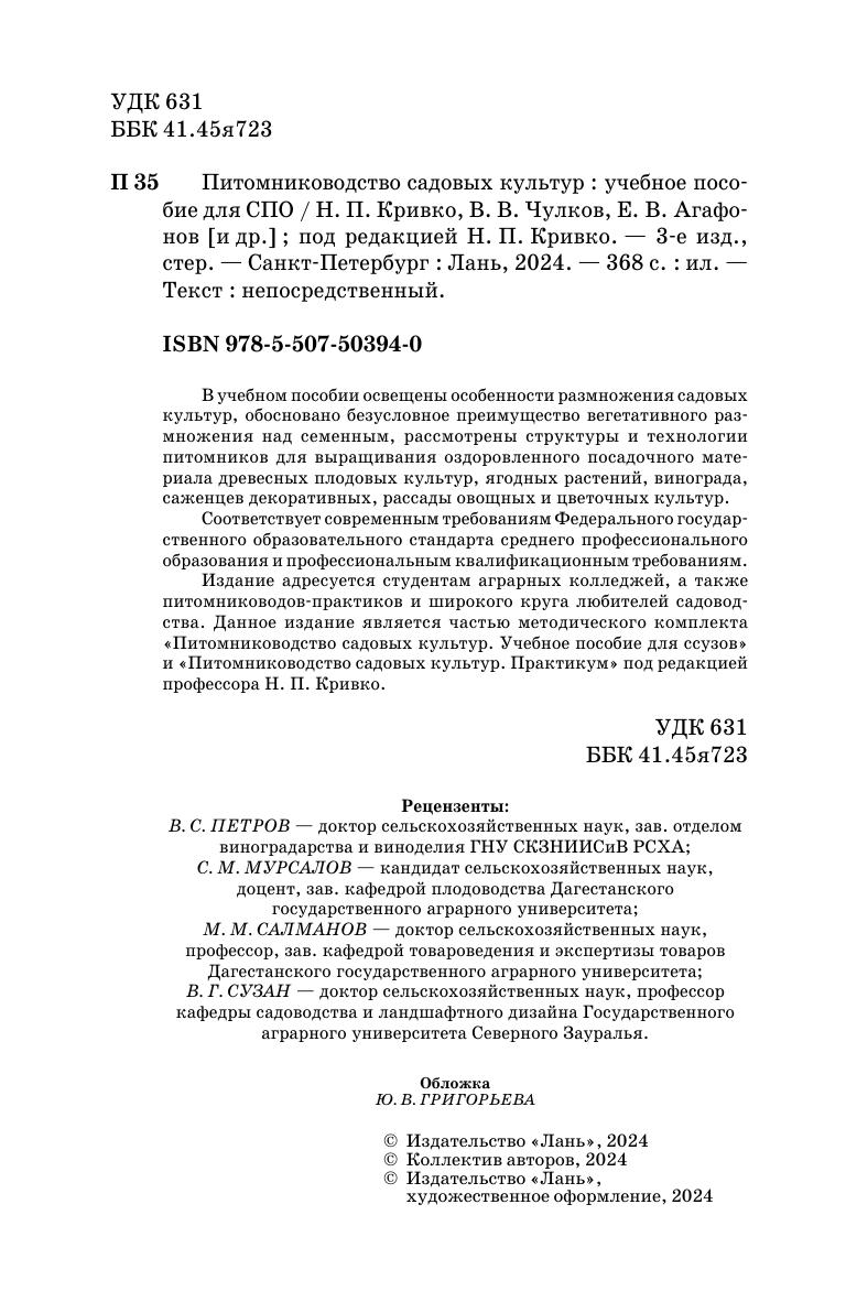 В учебном пособии освещены особенности размножения садовых культур, обосновано безусловное преимущество вегетативного размножения над семенным, рассмотрены структуры и технологии питомников для выращивания оздоровленного посадочного материала древесных плодовых культур, ягодных растений, винограда, саженцев декоративных, рассады овощных и цветочных культур. Издание адресуется студентам аграрных колледжей, а также питомниководов-практиков и широкого круга любителей садоводства. Данное издание является частью методического комплекта «Питомниководство садовых культур. Учебное пособие для ссузов» и «Питомниководство садовых культур. Практикум» под редакцией профессора Н. П.Кривко.