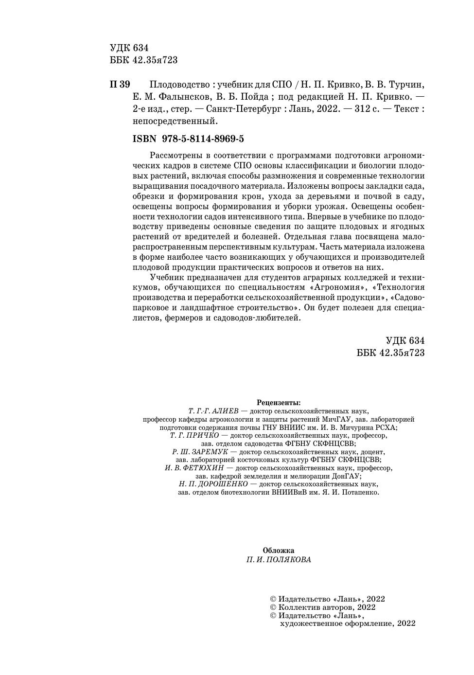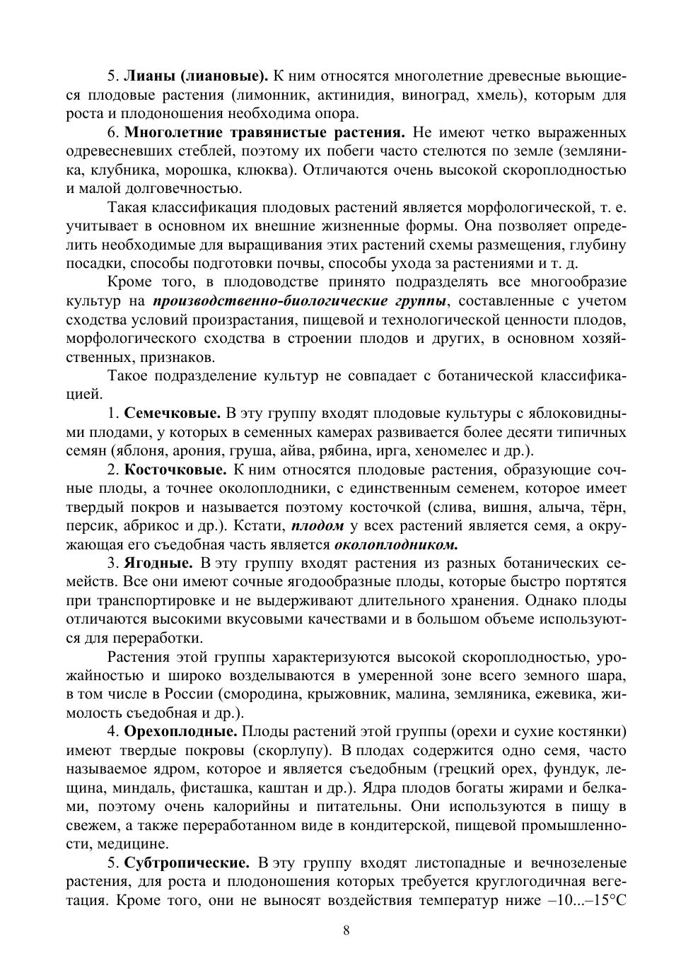 Рассмотрены в соответствии с программами подготовки агрономических кадров в системе СПО основы классификации и биологии плодовых растений, включая способы размножения и современные технологии выращивания поса-дочного материала. Изложены вопросы закладки сада, обрезки и формирования крон, ухода за деревьями и почвой в саду, освещены вопросы формирования и уборки урожая. Освещены особенности технологии садов интенсивного типа. Впервые в учебнике по плодоводству приведены основные сведения по защите плодовых и ягодных растений от вредителей и болезней.