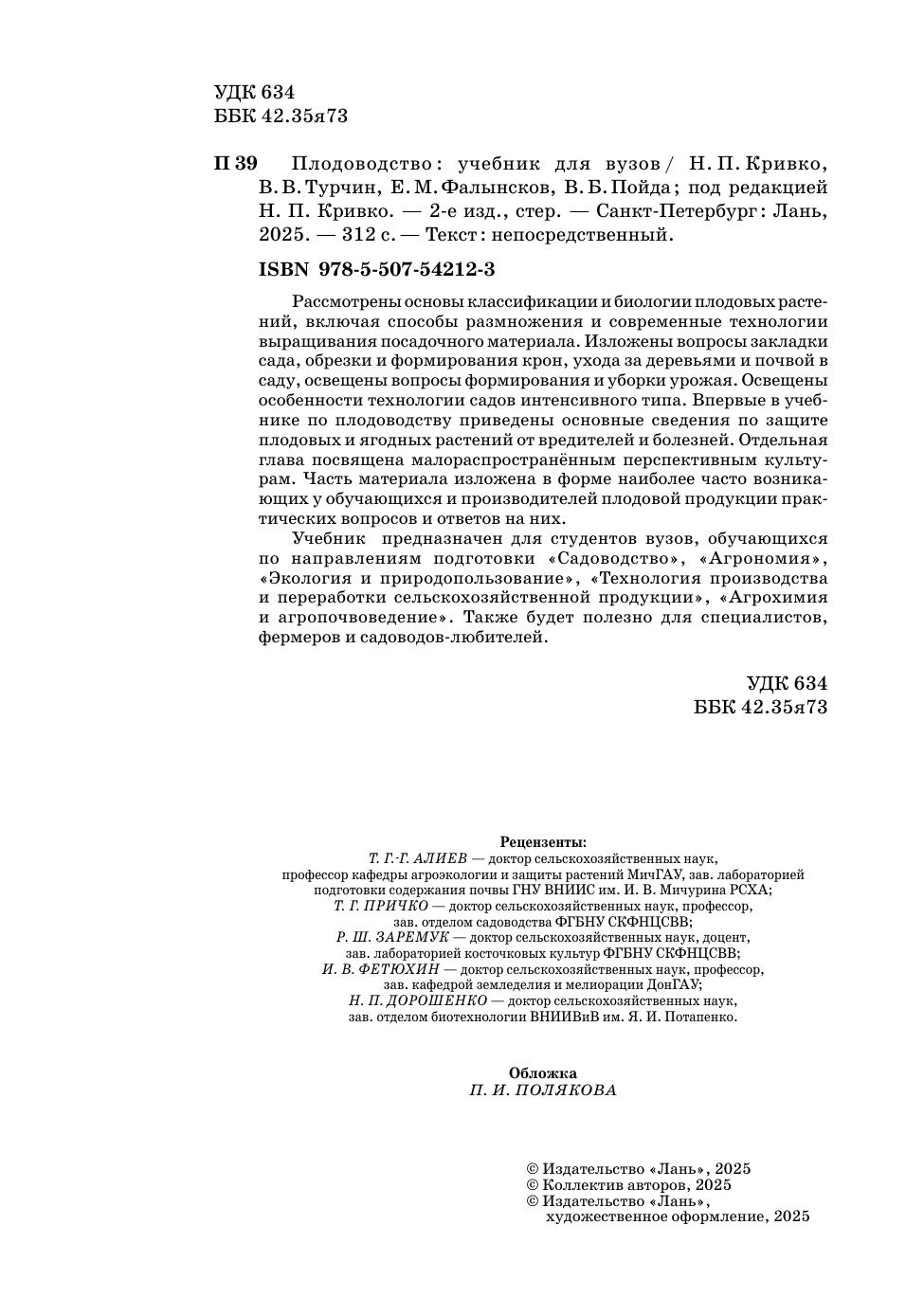Рассмотрены основы классификации и биологии плодовых растений, включая способы размножения и современные технологии выращивания посадочного материала. Изложены вопросы закладки сада, обрезки и формирования крон, ухода за деревьями и почвой в саду, освещены вопросы формирования и уборки урожая. Освещены особенности технологии садов интенсивного типа. Впервые в учебнике по плодоводству приведены основные сведения по защите плодовых и ягодных растений от вредителей и болезней. Отдельная глава посвящена малораспространённым перспективным культурам. Часть материала изложена в форме наиболее часто возникающих у обучающихся и производителей плодовой продукции практических вопросов и ответов на них. Учебник предназначен для студентов вузов, обучающихся по направлениям подготовки «Садоводство», «Агрономия», «Экология и природопользование», «Технология производства и переработки сельскохозяйственной продукции», «Агрохимия и агропочвоведение». Также будет полезно для специалистов, фермеров и садоводов-любителей.
