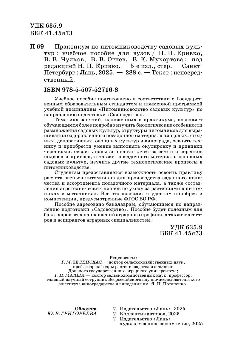 Учебное пособие подготовлено в соответствии с Государственным образовательным стандартом и примерной программой учебной дисциплины «Питомниководство садовых культур» по направлению подготовки «Садоводство». Тематика занятий, изложенных в практикуме, позволяет обучающимся более подробно изучить биологические особенности размножения садовых культур, структуры питомников для выращивания оздоровленного посадочного материала плодовых, ягодных, декоративных, овощных культур и винограда, освоить технику и приобрести умение выполнять окулировку и прививки черенками, освоить навыки оценки качества семян и черенков подвоев и привоев, а также посадочного материала основных садовых культур, изучить другие технологические процессы в питомниководстве. Студентам предоставляется возможность освоить практику расчета звеньев питомников для производства заданного количества и ассортимента посадочного материала, а также составления агротехнических планов по уходу за растениями в питомниках и в маточниках. Все это позволит студентам приобрести компетенции, предусмотренные ФГОС ВО РФ. Пособие адресовано бакалаврам, обучающимся по направлению подготовки «Садоводство». Пособие будет полезным для бакалавров всех направлений аграрного профиля, а также магистров и аспирантов аграрных специальностей.