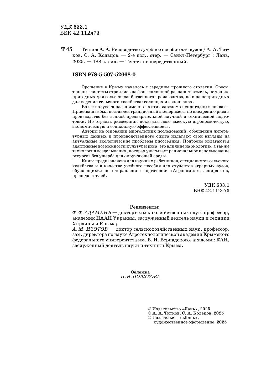 Орошение в Крыму началось с середины прошлого столетия. Оросительные системы строились на фоне сплошной распашки земель, не только пригодных для сельскохозяйственного производства, но и на непригодных для ведения сельского хозяйства: солонцах и солончаках. Более полувека назад именно на этих заведомо непригодных почвах в Присивашье был поставлен грандиозный эксперимент по внедрению риса в производство без всякой предварительной научной и технической подготовки. Но отрасль рисосеяния показала свою высокую агрономическую, экономическую и социальную эффективность. Авторы на основании многолетних исследований, обобщения литературных данных и производственного опыта излагают свои взгляды на актуальные экологические проблемы рисосеяния. Подробно излагаются адаптивные возможности культуры риса, его влияние на экологию, а также технология возделывания, которая учитывает рациональное использование ресурсов без ущерба для окружающей среды. Книга предназначена для научных работников, специалистов сельского хозяйства и в качестве учебного пособия для студентов аграрных вузов, обучающихся по направлению подготовки «Агрономия», аспирантов, преподавателей.