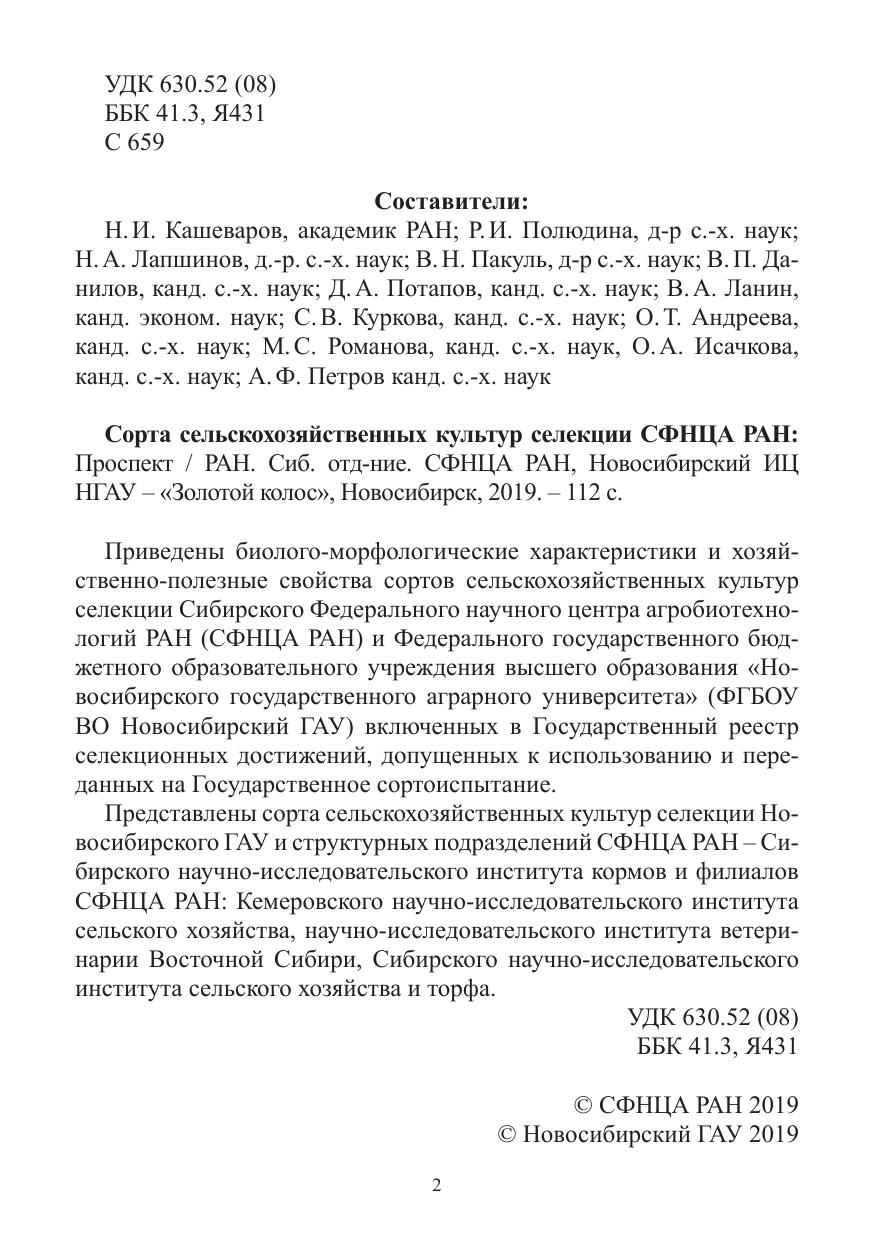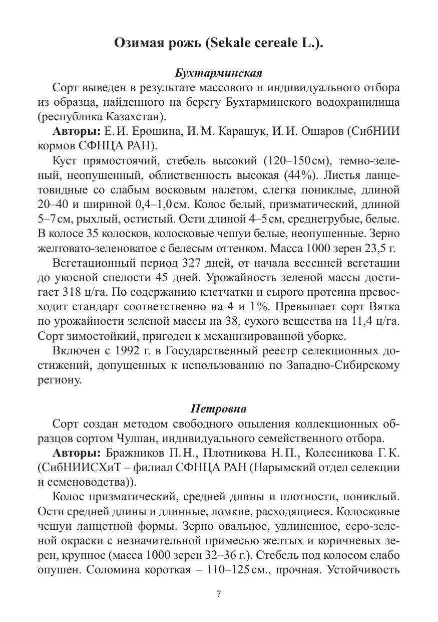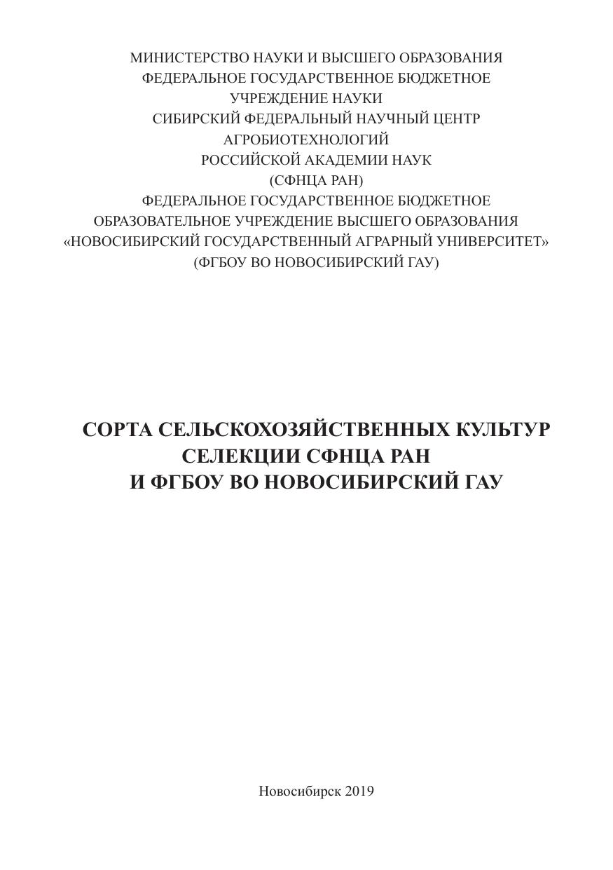 Приведены биолого-морфологические характеристики и хозяйственно-полезные свойства сортов сельскохозяйственных культур селекции Сибирского Федерального научного центра агробиотехнологий РАН (СФНЦА РАН) и Федерального государственного бюджетного образовательного учреждения высшего образования «Новосибирского государственного аграрного университета» (ФГБОУ ВО Новосибирский ГАУ) включенных в Государственный реестр селекционных достижений, допущенных к использованию и переданных на Государственное сортоиспытание. Представлены сорта сельскохозяйственных культур селекции Новосибирского ГАУ и структурных подразделений СФНЦА РАН – Сибирского научно-исследовательского института кормов и филиалов СФНЦА РАН: Кемеровского научно-исследовательского института сельского хозяйства, научно-исследовательского института ветеринарии Восточной Сибири, Сибирского научно-исследовательского института сельского хозяйства и торфа.