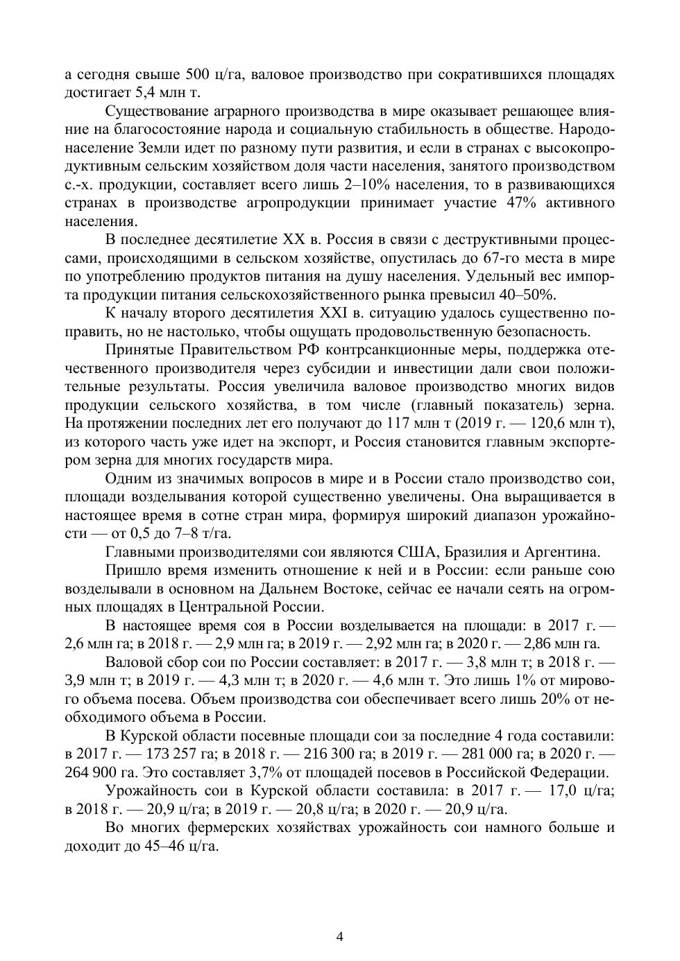 В данном учебном пособии собраны и обобщены современные техно-логии возделывания сои, научные опыты Курского ФАНЦ, различных сельскохозяйственных товаропроизводителей, фирм, компаний, фермер-ских хозяйств. Представлена научно обоснованная система возделывания сои, примеры практических производственных показателей в центральной зоне России. В издании прослежен путь об исторической миссии сельско-хозяйственной культуры сои как продукта широкого использования враз-личных областях деятельности человека: в сельском хозяйстве, промыш-ленности, медицине и в других направлениях. Здесь же показан опыт рынка по сое, его конъюнктура в мировом масштабе — развитие рынка, площади посевов сои, урожайность, валовой сбор, экспорт и импорт по регионам истранам. Представлена систематизированная информация о биологиче-ских, физиологических и многих других свойствах культуры сои. Описаны новые современные технологии, приемы работы с соей — от генетических возможностей до современных, изученных методов работы с удобрениями, микробиологическими препаратами, севообороты, обработка почвы, система ухода за растениями, средства защиты от сорняков, вредителей и болезней, система уборки с ее капризами, сортировка, техника и механизмы очистки, хранение семенного и продовольственного зерна. Большой упор сделан на сорта отечественных селекционеров центральной зоны России, отвечающие современным требованиям для народного хозяйства, промышленности идругих направлений использования сои и продуктов ее переработки. Данное пособие предназначено для широкого круга читателей — научных работников учреждений, аспирантов, студентов, специалистов АПК, руководителей компаний, фермеров, специалистов пищевой, комбикормовой, медицинской и других отраслей промышленности, заинтересованных в возделывании сои.