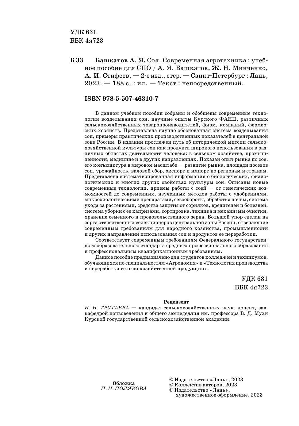 В данном учебнм пособии собраны и обобщены современные технологии возделывания сои, научные опыты Курского ФАНЦ, различных сельскохозяйственных товаропроизводителей, фирм, компаний, фермерских хозяйств. Представлена научно — обоснованная система возделывания сои, примеры практических производственных показателей в центральной зоне России. В издании прослежен путь об исторической миссии сельскохозяйственной культуры сои, как продукта широкого использования в различных областях деятельности человека: в сельском хозяйстве, промышленности, медицине и в других направлениях. Показан опыт рынка по сое, его конъюнктура в мировом масштабе — развитие рынка, площади посевов сои, урожайность, валовой сбор, экспорт и импорт по регионам и странам. Представлена систематизированная информация о биологических, физиологических и многих других свойствах культуры сои. Описаны новые современные технологии, приемы работы с соей — от генетических возможностей до современных, изученных методов работы с удобрениями, микробиологическими препаратами, севообороты, обработка почвы, система ухода за растениями, средства защиты от сорняков, вредителей и болезней, система уборки с ее капризами, сортировка, техника и механизмы очистки, хранение семенного и продовольственного зерна. Большой упор сделан на сорта отечественных селекционеров центральных зон России, отвечающих современным требованиям для народного хозяйства, промышленности и других направлений использования сои и продуктов ее переработки. Соответствует современным требованиям Федерального государственного образовательного стандарта среднего профессионального образования и профессиональным квалификационным требованиям. Данное пособие предназначено для студентов колледжей и техникумов, обучающихся по специальностям «Агрономия» и «Технология производства и переработки сельскохозяйственной продукции».