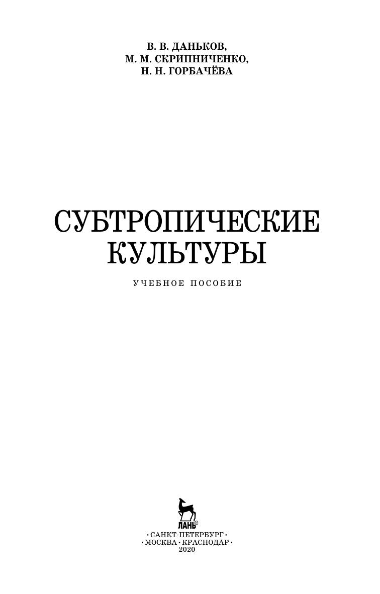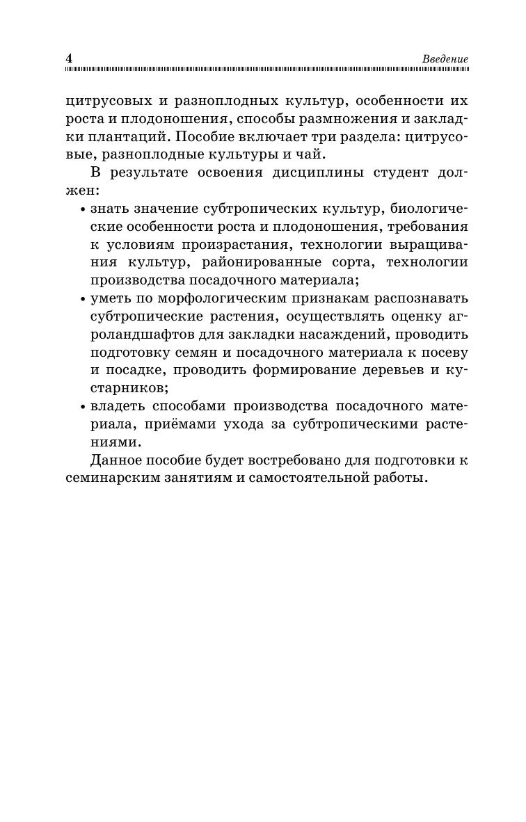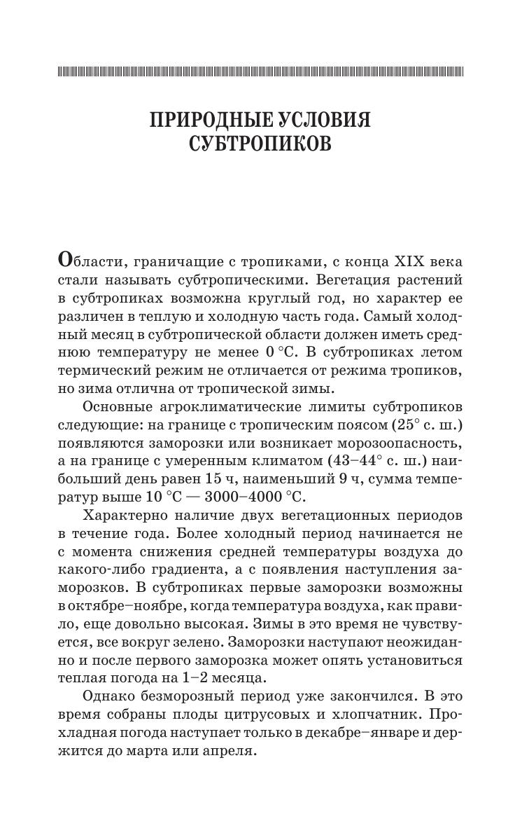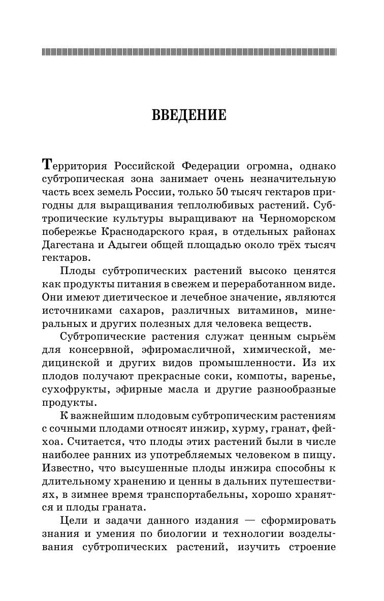 В учебном пособии рассматриваются классификация, происхождение и биологические особенности субтропических растений. Рассмотрены общие технологические вопросы, обеспечивающие получение высоких и стабильных урожаев. Особое внимание уделено защите цитрусовых от морозов, траншейной и комнатной культуре цитрусовых. Вторая часть пособия знакомит с основными разноплодными субтропическими культурами и чаем. Изложены технологии возделывания этих культур.