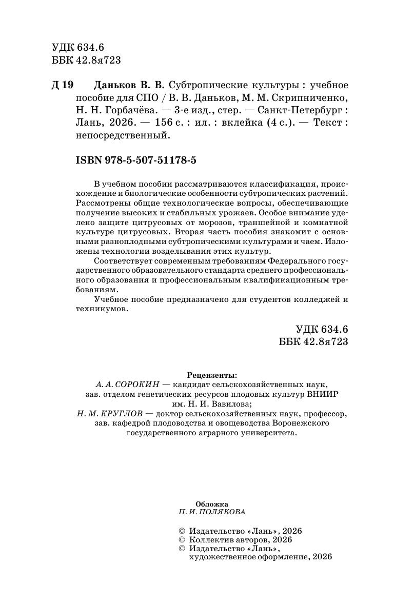 В учебном пособии рассматриваются классификация, происхождение и биологические особенности субтропических растений. Рассмотрены общие технологические вопросы, обеспечивающие получение высоких и стабильных урожаев. Особое внимание уделено защите цитрусовых от морозов, траншейной и комнатной культуре цитрусовых. Вторая часть пособия знакомит с основными разноплодными субтропическими культурами и чаем. Изложены технологии возделывания этих культур. Соответствует современным требованиям Федерального государственного образовательного стандарта среднего профессионального образования и профессиональным квалификационным требованиям. Учебное пособие предназначено для студентов колледжей и техникумов.
