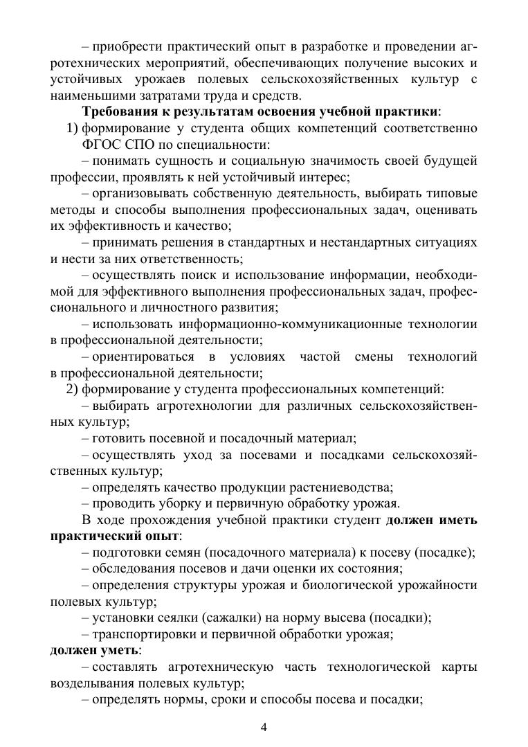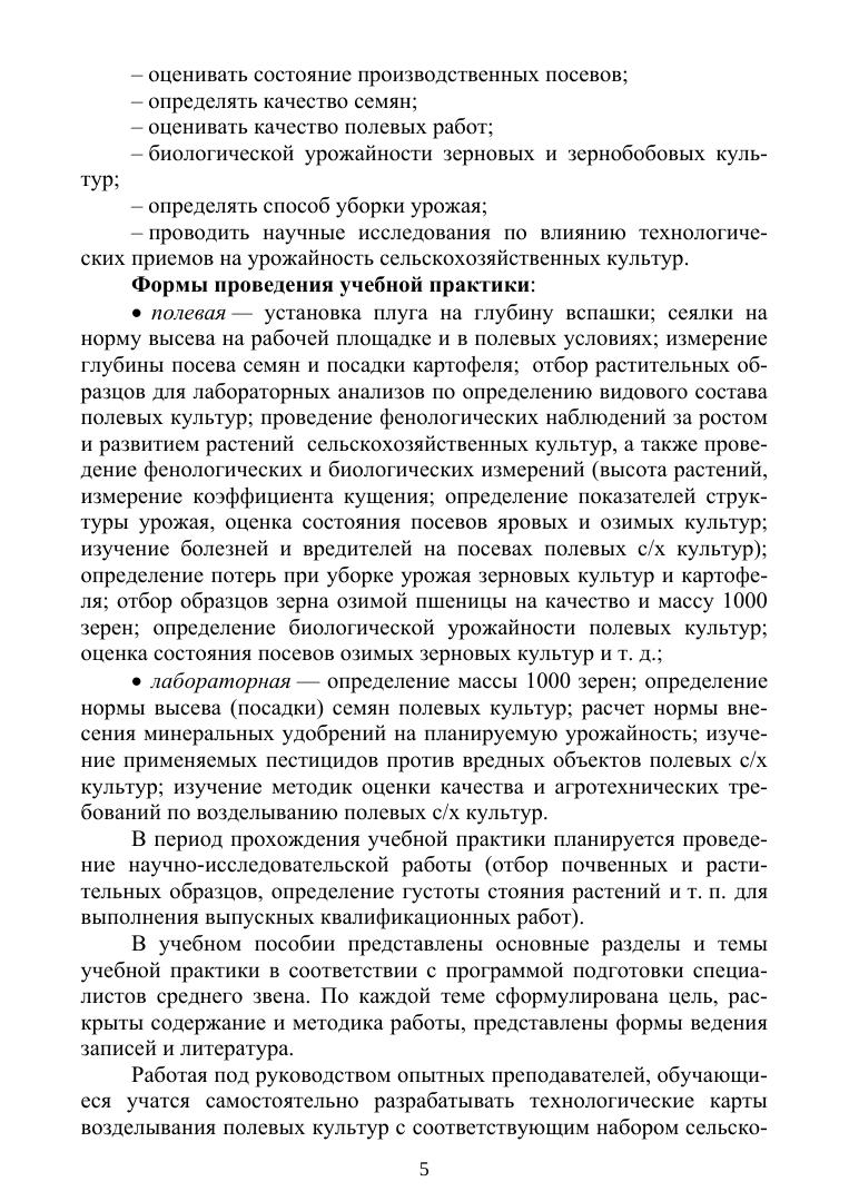 Учебное пособие разработано в соответствии с компетентностными требованиями ФГОС СПО и программой подготовки специалистов среднего звена по специальности «Агрономия». Пособие включает темы занятий, направленных на изучение организационно-хозяйственных основ получения продукции растениеводства. Дана методика составления технологической карты возделывания полевых культур. В доступной форме представлен материал по изучению подготовки посевного и посадочного материала, изложены особенности подготовки почвы под посев полевых культур, даны расчеты нормы высева семян зерновых культур и посадочного материала картофеля, правила установки сеялки на норму высева. Цель занятий — изучение в полевых условиях состояния посевов в различные фазы роста и развития, уход за посевами полевых культур. По всем темам представлены формы ведения записей.
