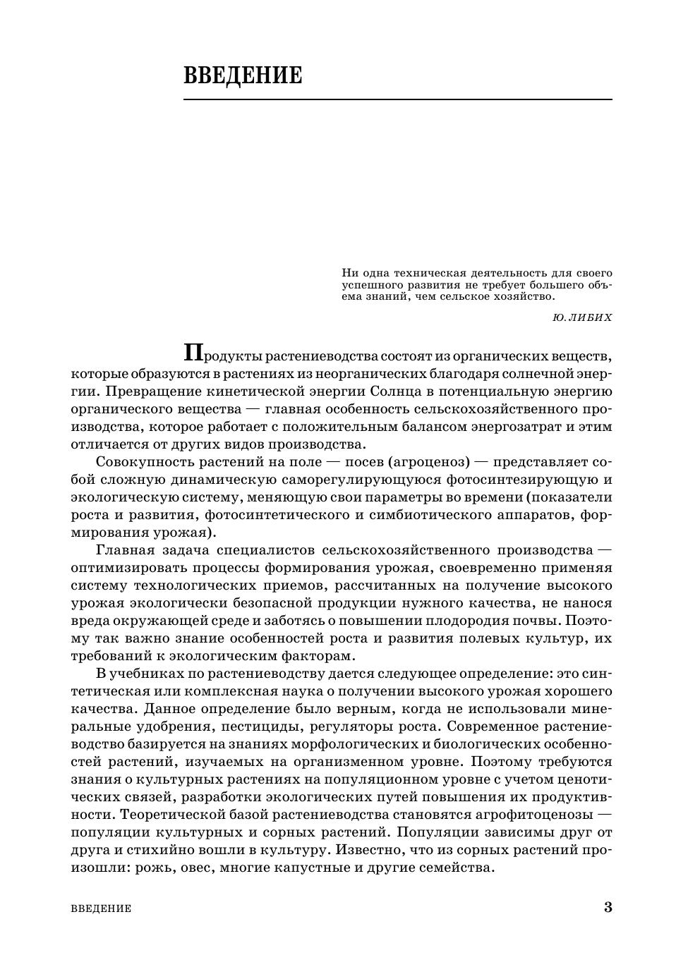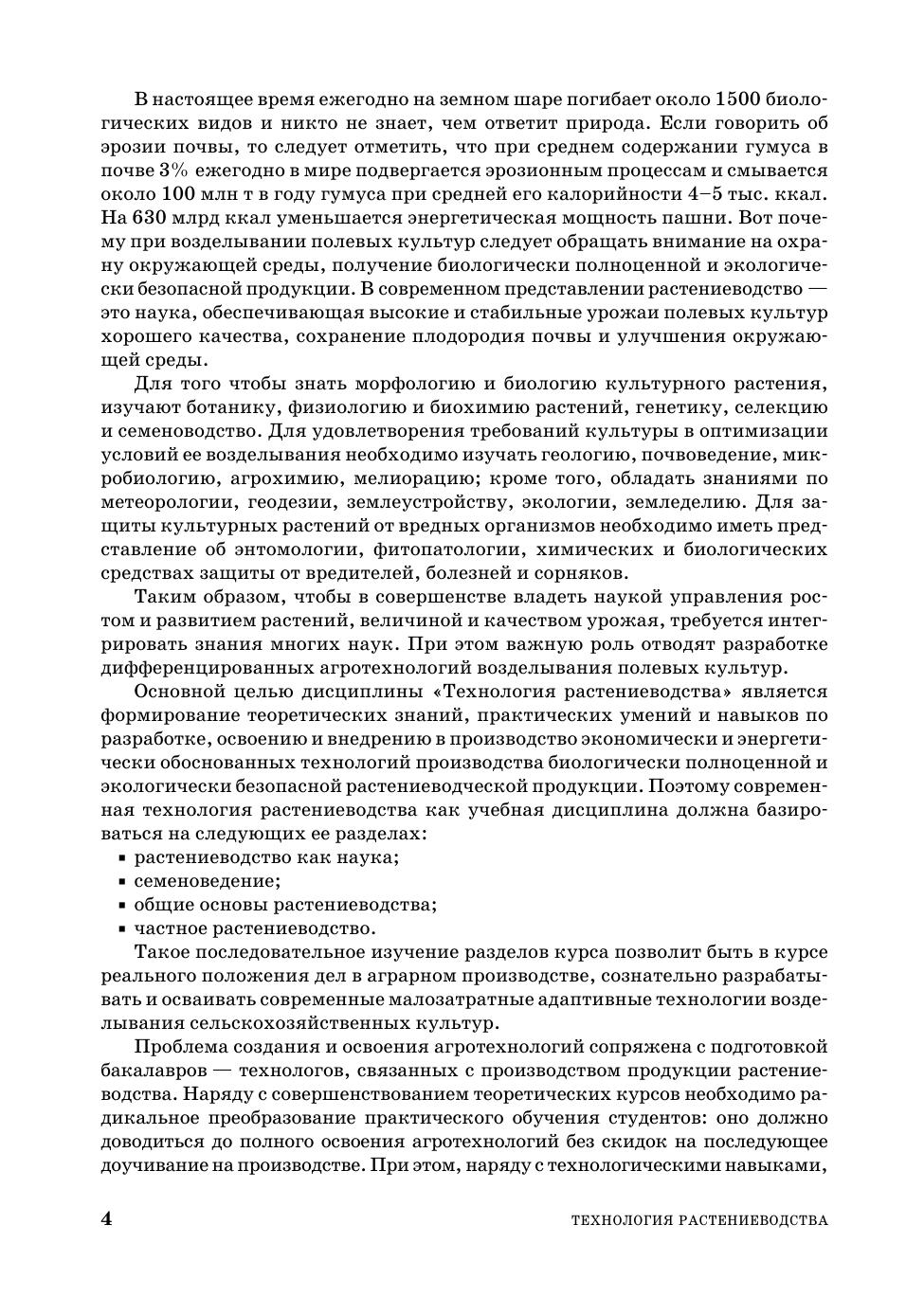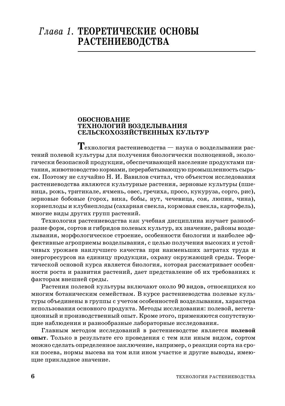 В учебном пособии изложены основные теоретические вопросы растениеводства как науки и отрасли сельскохозяйственного производства. Сформулированы цель и задачи растениеводства, понятие о полевой культуре. Изложены основы семеноведения. Рассмотрены ботанические и биологические особенности основных полевых культур. Приводятся базовые агротехнологии производства важнейших полевых культур — районированные и перспективные экологически пластичные сорта, особенности размещения в севообороте, ресурсосберегающие способы обработки почв, агроэкологически обоснованные системы удобрений, посев, уход за посевами, экологически безопасные системы защиты растений от вредителей, болезней и сорняков, особенности проведения уборки урожая, послеуборочная обработка и хранение полученной продукции. Рассмотрено проведение механизированных работ с использованием современной сельскохозяйственной техники и точным соблюдением агротехнических требований. Предназначено для студентов вузов, обучающихся по направлениям «Агрономия», «Технология производства и переработки сельскохозяйственной продукции», «Агрохимия и агропочвоведение». Представляет интерес и имеет практическую значимость для подготовки бакалавров по направлению «Агроинженерия», а также для слушателей факультетов повышения квалификации работников агропромышленного комплекса.
