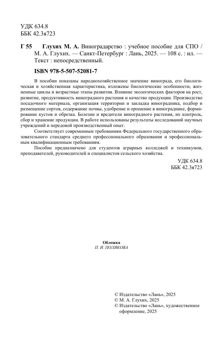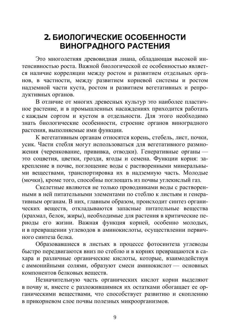 В пособии показаны народнохозяйственное значение винограда, его биологическая и хозяйственная характеристика, изложены биологические особенности, жизненные циклы и возрастные этапы развития. Влияние экологических факторов на рост, развитие, продуктивность виноградного растения и качество продукции. Производство посадочного материала, организация территории и закладка виноградника, подбор и размещение сортов, содержание почвы, удобрение и орошение в винограднике, формирование кустов и обрезка. Болезни и вредители виноградного растения, их контроль, сбор и хранение продукции. В работе использованы результаты исследований научных учреждений и передовой производственный опыт. Соответствует современным требованиям Федерального государственного образовательного стандарта среднего профессионального образования и профессиональным квалификационным требованиям. Пособие предназначено для студентов аграрных колледжей и техникумов, преподавателей, руководителей и специалистов сельского хозяйства.