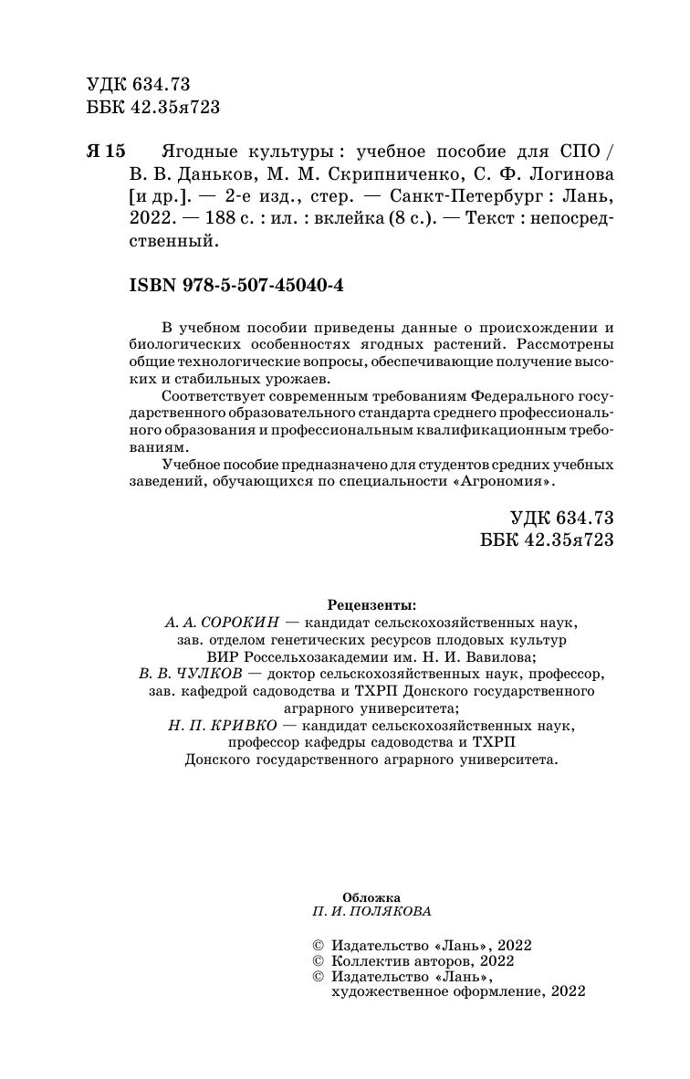 В учебном пособии приведены происхождение и биологические особенности ягодных растений. Рассмотрены общие технологические вопросы, обеспечивающие получение высоких и стабильных урожаев. Соответствует современным требованиям Федерального государственного образовательного стандарта среднего профессионального образования и профессиональным квалификационным требованиям. Учебное пособие предназначено для студентов средних учебных заведений, обучающихся по специальности «Агрономия».
