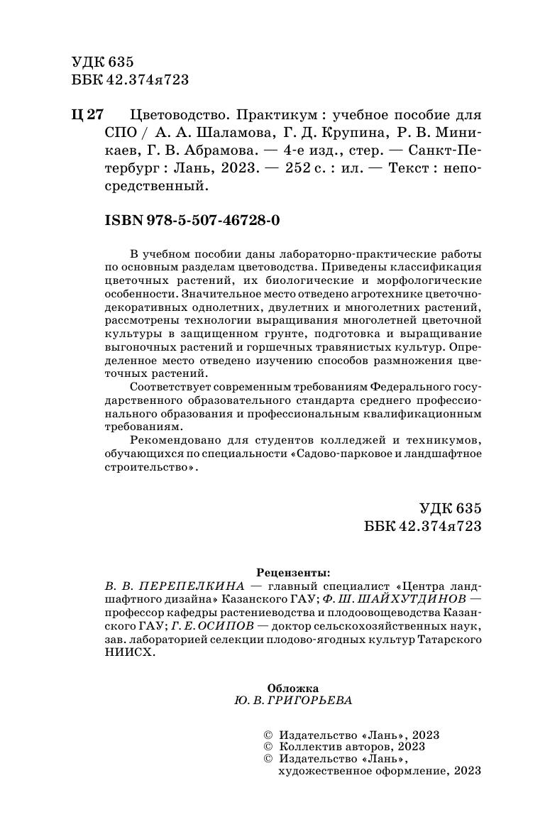 В учебном пособии даны лабораторно-практические работы по основным разделам цветоводства. Приведены классификация цветочных растений, их биологические и морфологические особенности. Значительное место отведено агротехнике цветочно-декоративных однолетних, двулетних и многолетних растений, рассмотрены технологии выращивания многолетней цветочной культуры в защищенном грунте, подготовка и выращивание выгоночных растений и горшечных травянистых культур. Определенное место отведено изучению способов размножения цветочных растений. Соответствует современным требованиям Федерального государственного образовательного стандарта среднего профессионального образования и профессиональным квалификационным требованиям. Рекомендовано для студентов колледжей и техникумов, обучающихся по специальности «Садово-парковое и ландшафтное строительство».
