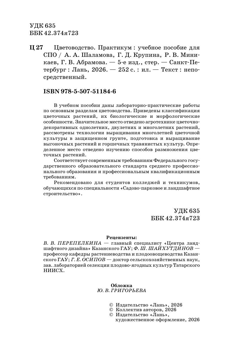 В учебном пособии даны лабораторно-практические работы по основным разделам цветоводства. Приведены классификация цветочных растений, их биологические и морфологические особенности. Значительное место отведено агротехнике цветочно-декоративных однолетних, двулетних и многолетних растений, рассмотрены технологии выращивания многолетней цветочной культуры в защищенном грунте, подготовка и выращивание выгоночных растений и горшечных травянистых культур. Определенное место отведено изучению способов размножения цветочных растений. Соответствует современным требованиям Федерального государственного образовательного стандарта среднего профессионального образования и профессиональным квалификационным требованиям. Рекомендовано для студентов колледжей и техникумов, обучающихся по специальности «Садово-парковое и ландшафтное строительство».