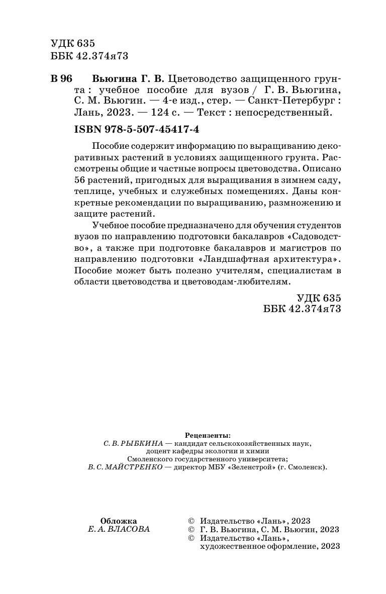 Пособие содержит информацию по выращиванию декоративных растений в условиях защищенного грунта. Рассмотрены общие и частные вопросы цветоводства. Описано 56 растений, пригодных для выращивания в зимнем саду, теплице, учебных и служебных помещениях. Даны конкретные рекомендации по выращиванию, размножению и защите растений. Учебное пособие предназначено для обучения студентов по направлению подготовки бакалавров «Садоводство», а также при подготовке бакалавров и магистров по направлению «Ландшафтная архитектура». Пособие может быть полезно учителям, специалистам в области цветоводства и цветоводам-любителям.