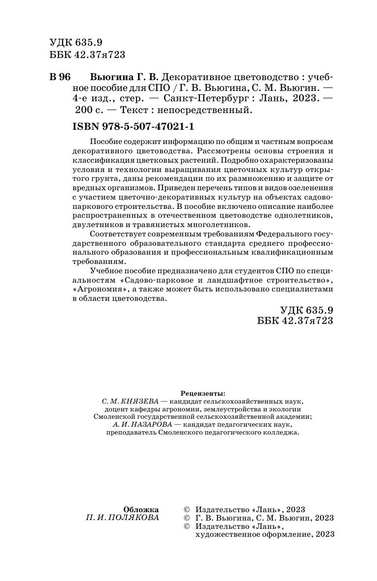 Пособие содержит информацию по общим и частным вопросам декоративного цветоводства. Рассмотрены основы строения и классификация цветковых растений. Подробно охарактеризованы условия и технологии выращивания цветочных культур открытого грунта, даны рекомендации по их размножению и защите от вредных организмов. Приведен перечень типов и видов озеленения с участием цветочнодекоративных культур на объектах садово-паркового строительства. В пособие включено описание наиболее распространенных в отечественном цветоводстве однолетников, двулетников и травянистых многолетников. Соответствует современным требованиям Федерального государственного образовательного стандарта среднего профессионального образования и профессиональным квалификационным требованиям. Учебное пособие предназначено для студентов СПО по специальности «Садово-парковое и ландшафтное строительство», «Агрономия», а также может быть использовано специалистами в области цветоводства.