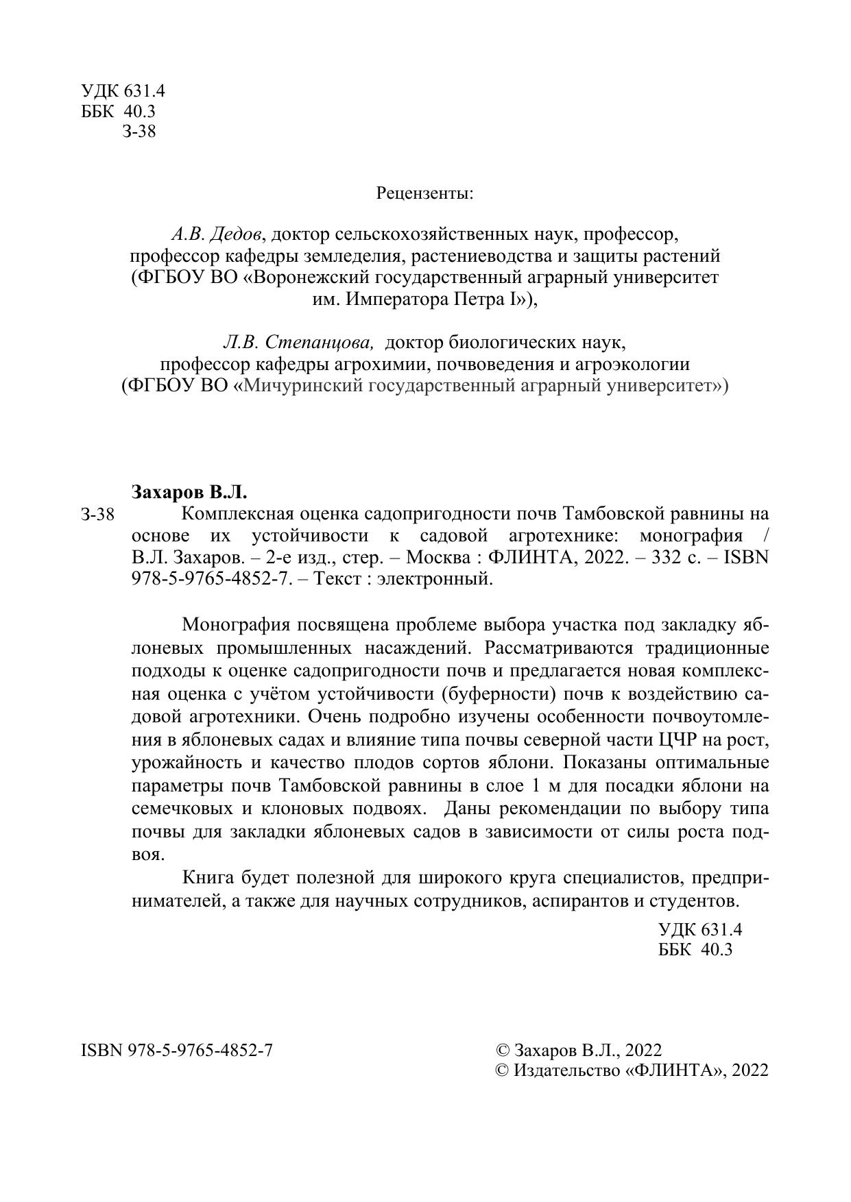 Монография посвящена проблеме выбора участка под закладку яблоневых промышленных насаждений. Рассматриваются традиционные подходы к оценке садопригодности почв и предлагается новая комплексная оценка с учётом устойчивости (буферности) почв к воздействию садовой агротехники. Очень подробно изучены особенности почвоутомления в яблоневых садах и влияние типа почвы северной части ЦЧР на рост, урожайность и качество плодов сортов яблони. Показаны оптимальные параметры почв Тамбовской равнины в слое 1 м для посадки яблони на семечковых и клоновых подвоях. Даны рекомендации по выбору типа почвы для закладки яблоневых садов в зависимо-сти от силы роста подвоя.