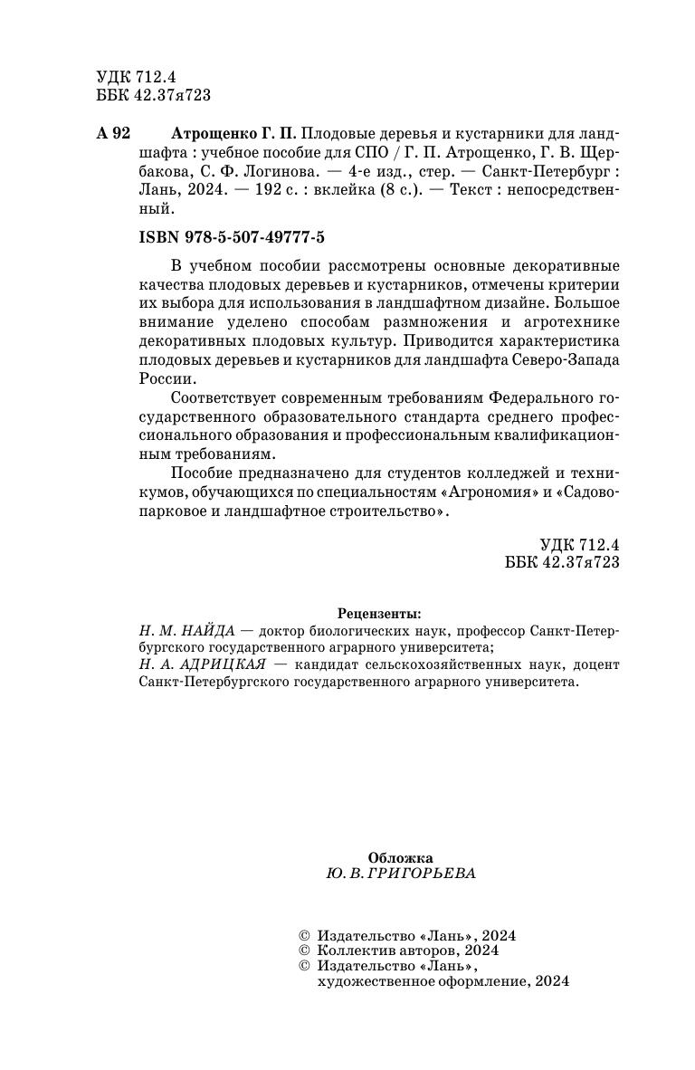 В учебном пособии рассмотрены основные декоративные качества плодовых деревьев и кустарников, отмечены критерии выбора их для использования в ландшафтном дизайне. Большое внимание уделено способам размножения и агротехнике декоративных плодовых культур. Приводится характеристика плодовых деревьев и кустарников для ландшафта Северо-Запада России. Соответствует современным требованиям Федерального государственного образовательного стандарта среднего профессионального образования и профессиональным квалификационным требованиям. Пособие предназначено для студентов колледжей и техникумов, обучающихся по специальностям "Агрономия" и "Садово-парковое и ландшафтное строительство".