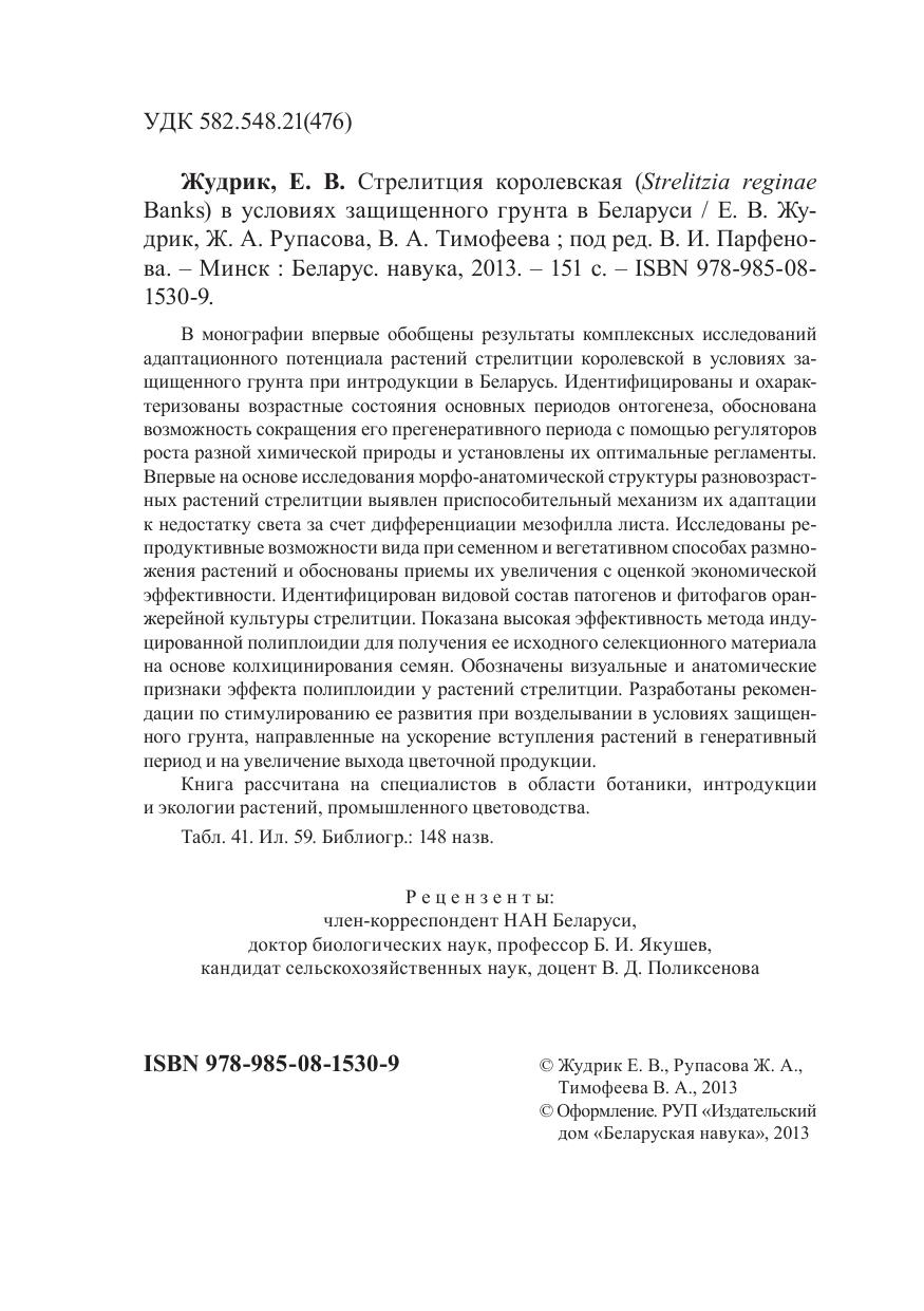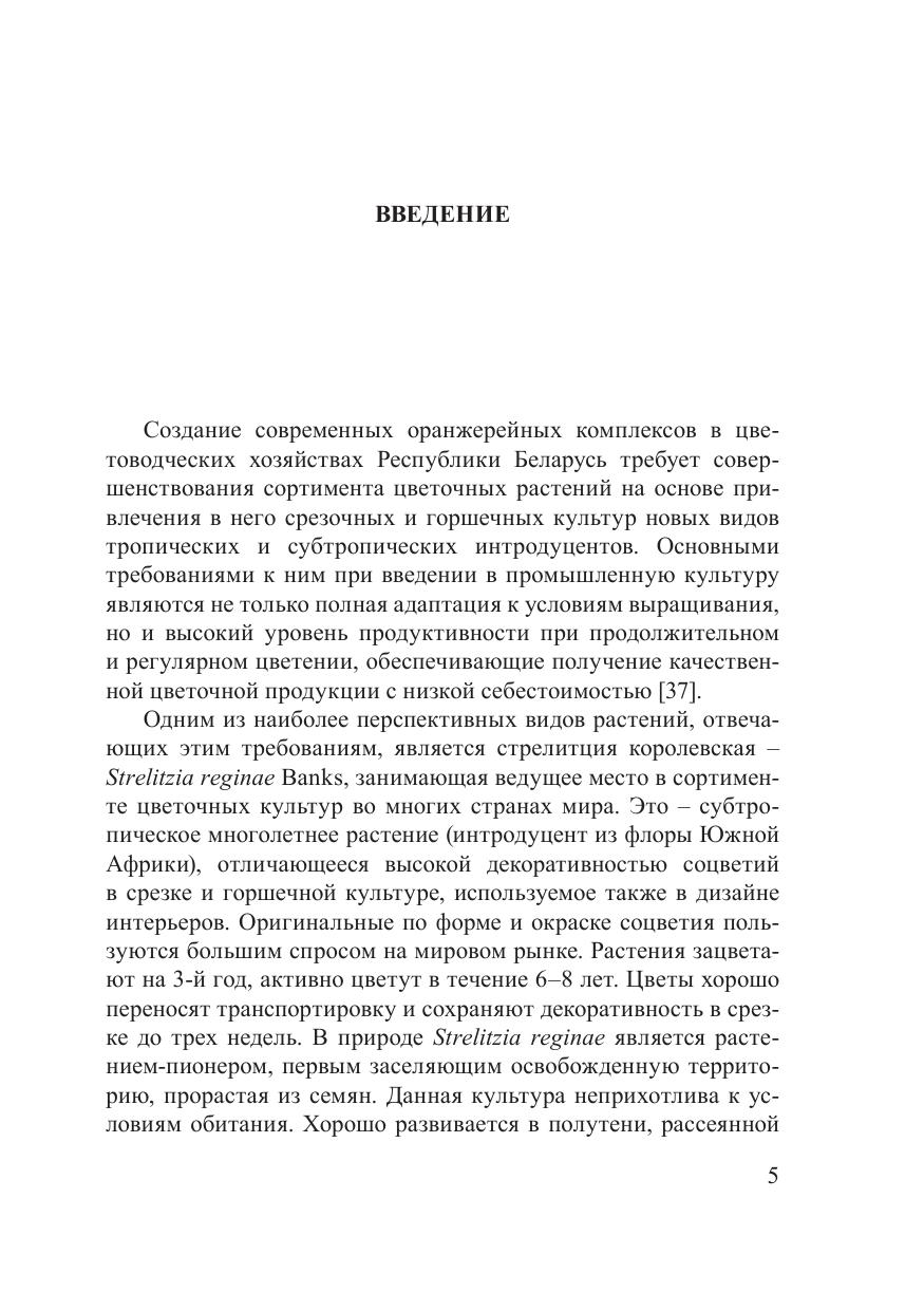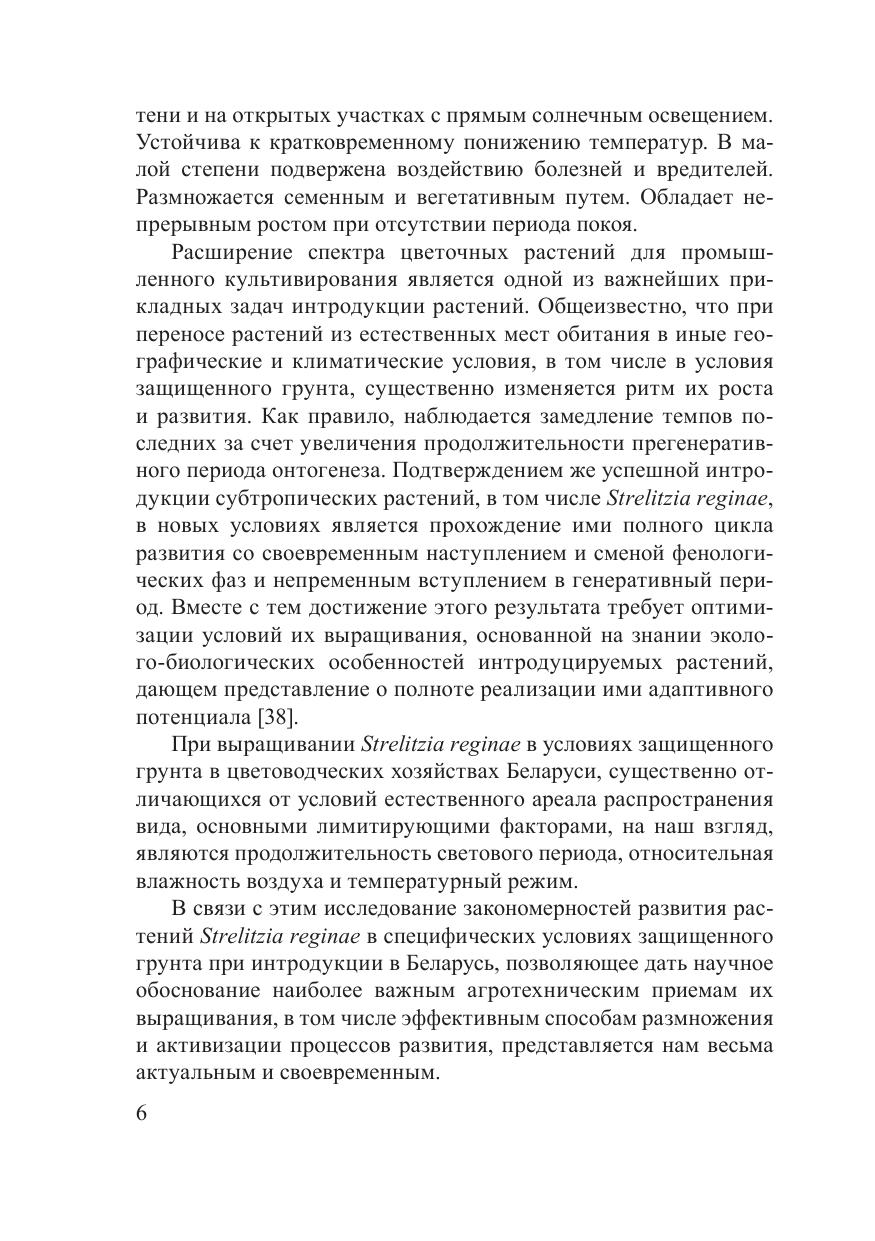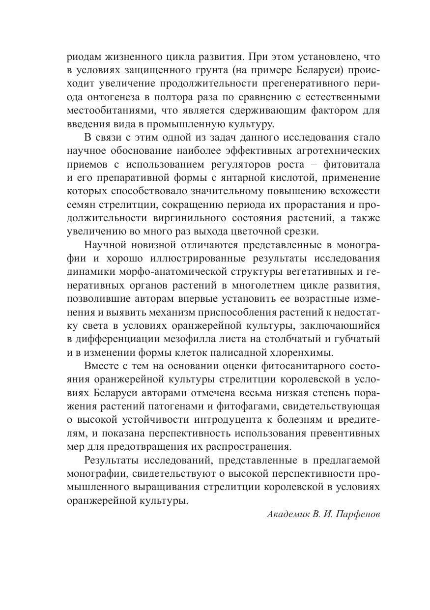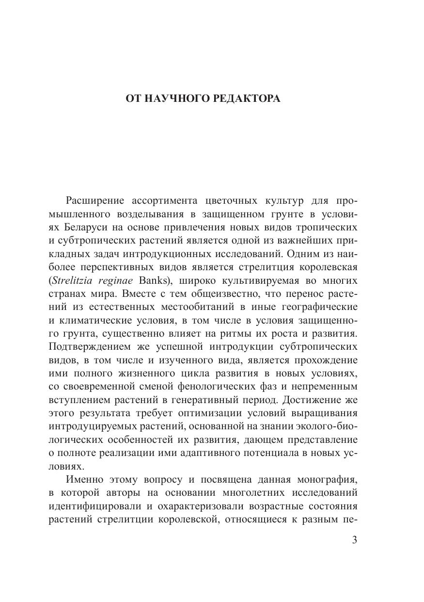 В монографии впервые обобщены результаты комплексных исследований адаптационного потенциала растений стрелитции королевской в условиях защищенного грунта при интродукции в Беларусь. Идентифицированы и охарактеризованы возрастные состояния основных периодов онтогенеза, обоснована возможность сокращения его прегенеративного периода с помощью регуляторов роста разной химической природы и установлены их оптимальные регламенты. Впервые на основе исследования морфо-анатомической структуры разновозрастных растений стрелитции выявлен приспособительный механизм их адаптации к недостатку света за счет дифференциации мезофилла листа. Исследованы репродуктивные возможности вида при семенном и вегетативном способах размножения растений и обоснованы приемы их увеличения с оценкой экономической эффективности. Идентифицирован видовой состав патогенов и фитофагов оранжерейной культуры стрелитции. Показана высокая эффективность метода индуцированной полиплоидии для получения ее исходного селекционного материала на основе колхицинирования семян. Обозначены визуальные и анатомические признаки эффекта полиплоидии у растений стрелитции. Разработаны рекомендации по стимулированию ее развития при возделывании в условиях защищенного грунта, направленные на ускорение вступления растений в генеративный период и на увеличение выхода цветочной продукции. Книга рассчитана на специалистов в области ботаники, интродукции и экологии растений, промышленного цветоводства.