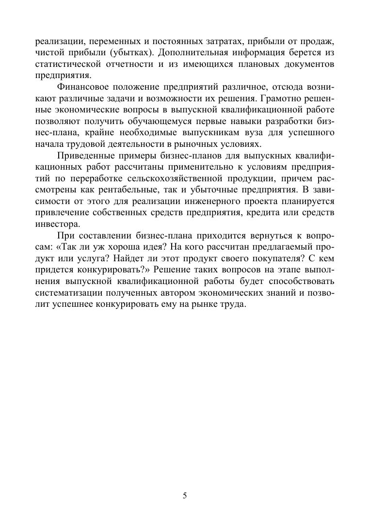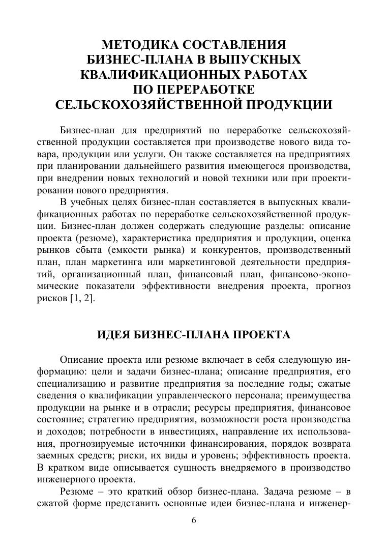 Изложена методика составления бизнес-плана в выпускных квалификационных работах по переработке сельскохозяйственной продукции. Приведены примеры составления бизнес-планов для реконструируемых и проектируемых предприятий по переработке сельскохозяйственной продукции.