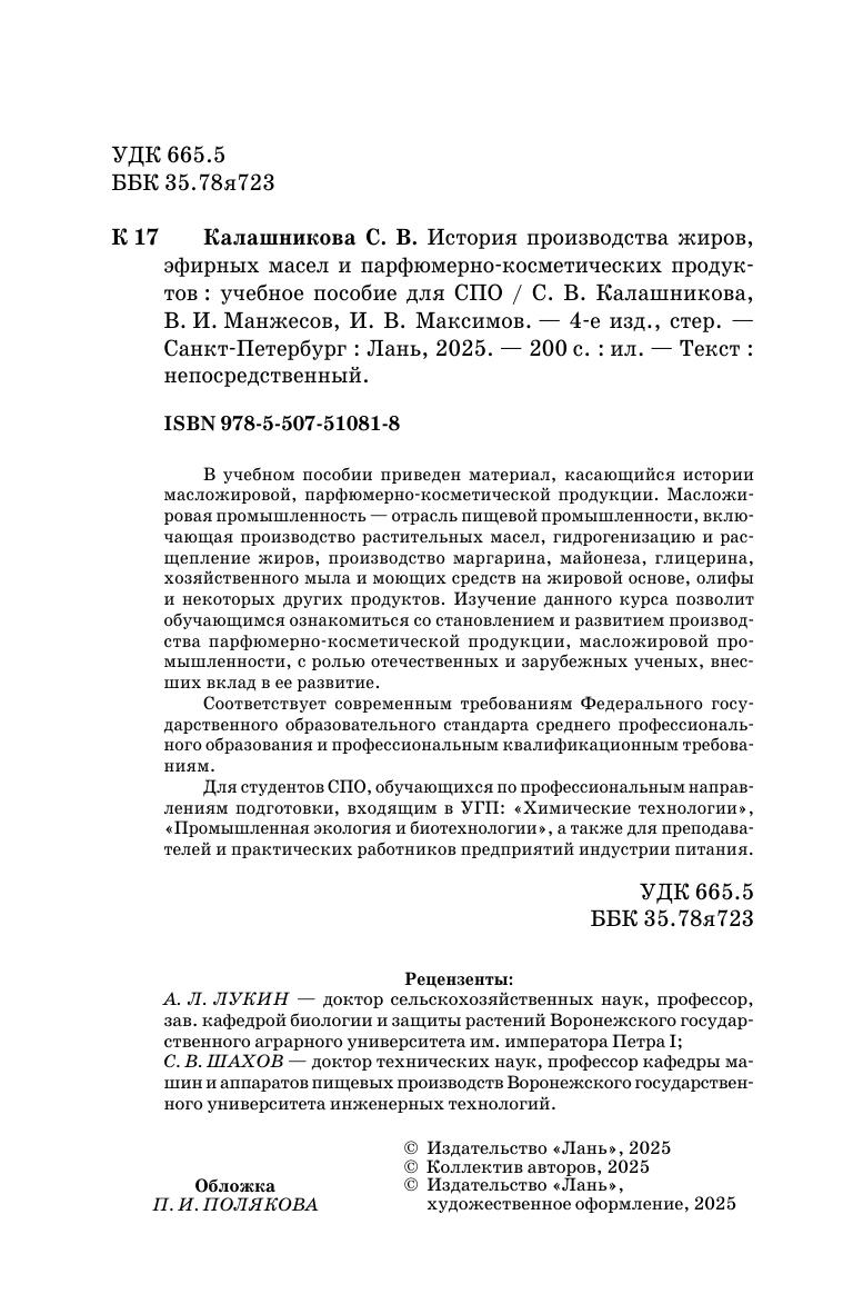 В учебном пособии приведен материал, касающийся истории масложировой, парфюмерно-косметической продукции. Масложировая промышленность — отрасль пищевой промышленности, включающая производство растительных масел, гидрогенизацию и расщепление жиров, производство маргарина, майонеза, глицерина, хозяйственного мыла и моющих средств на жировой основе, олифы и некоторых других продуктов. Изучение данного курса позволит обучающимся ознакомиться со становлением и развитием производства парфюмерно-косметической продукции, масложировой промышленности, с ролью отечественных и зарубежных ученых, внесших вклад в ее развитие. Соответствует современным требованиям Федерального государственного образовательного стандарта среднего профессионального образования и профессиональным квалификационным требованиям. Для студентов СПО, обучающихся по профессиональным направлениям подготовки, входящим в УГП: «Химические технологии», «Промышленная экология и биотехнологии», а также для преподавателей и практических работников предприятий индустрии питания.