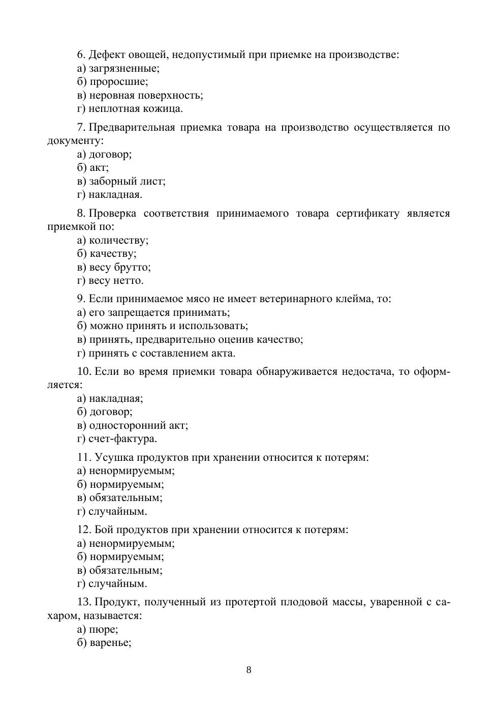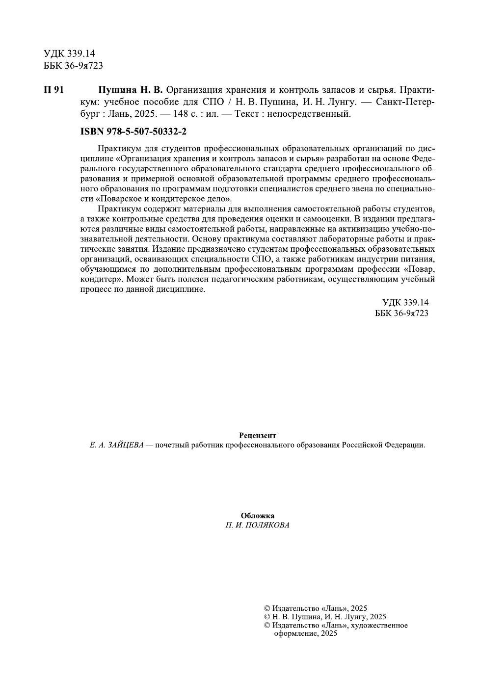 Практикум для студентов профессиональных образовательных организаций по дисциплине «Организация хранения и контроль запасов и сырья» разработан на основе Федерального государственного образовательного стандарта среднего профессионального образования и примерной основной образовательной программы среднего профессионального образования по программам подготовки специалистов среднего звена по специальности «Поварское и кондитерское дело». Практикум содержит материалы для выполнения самостоятельной работы студентов, а также контрольные средства для проведения оценки и самооценки. В издании предлагаются различные виды самостоятельной работы, направленные на активизацию учебно-познавательной деятельности. Основу практикума составляют лабораторные работы и практические занятия. Издание предназначено студентам профессиональных образовательных организаций, осваивающих специальности СПО, а также работникам индустрии питания, обучающимся по дополнительным профессиональным программам профессии «Повар, кондитер». Может быть полезен педагогическим работникам, осуществляющим учебный процесс по данной дисциплине.