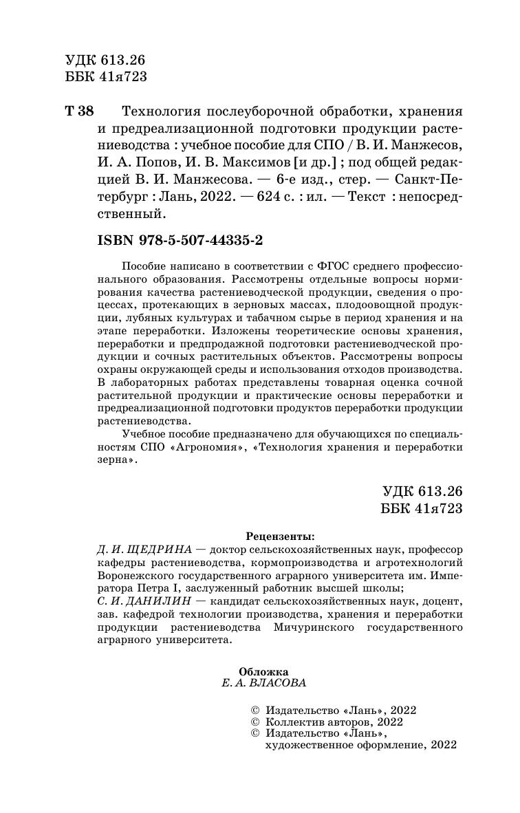 Пособие написано в соответствии с ФГОС среднего профессионального образования. Рассмотрены отдельные вопросы нормирования качества растениеводческой продукции, сведения о процессах, протекающих в зерновых массах, плодоовощной продукции, лубяных культурах и табачном сырье в период хранения и на этапе переработки. Изложены теоретические основы хранения, переработки и предпродажной подготовки растениеводческой продукции и сочных растительных объектов. Рассмотрены вопросы охраны окружающей среды и использования отходов производства. Влабораторных работах представлена товарная оценка сочной растительной продукции и практические основы переработки и предреализационной подготовки продуктов переработки продукции растениеводства.