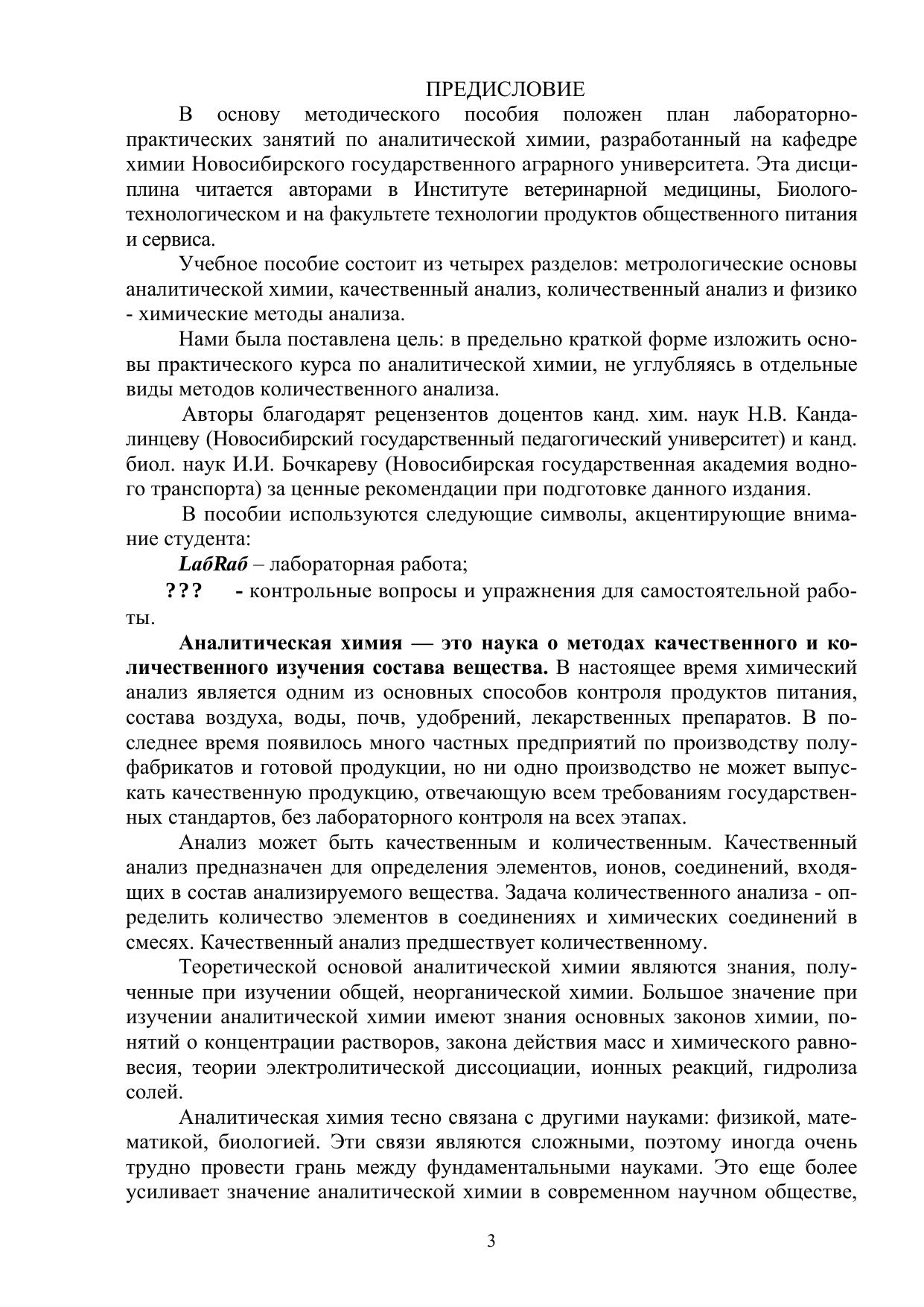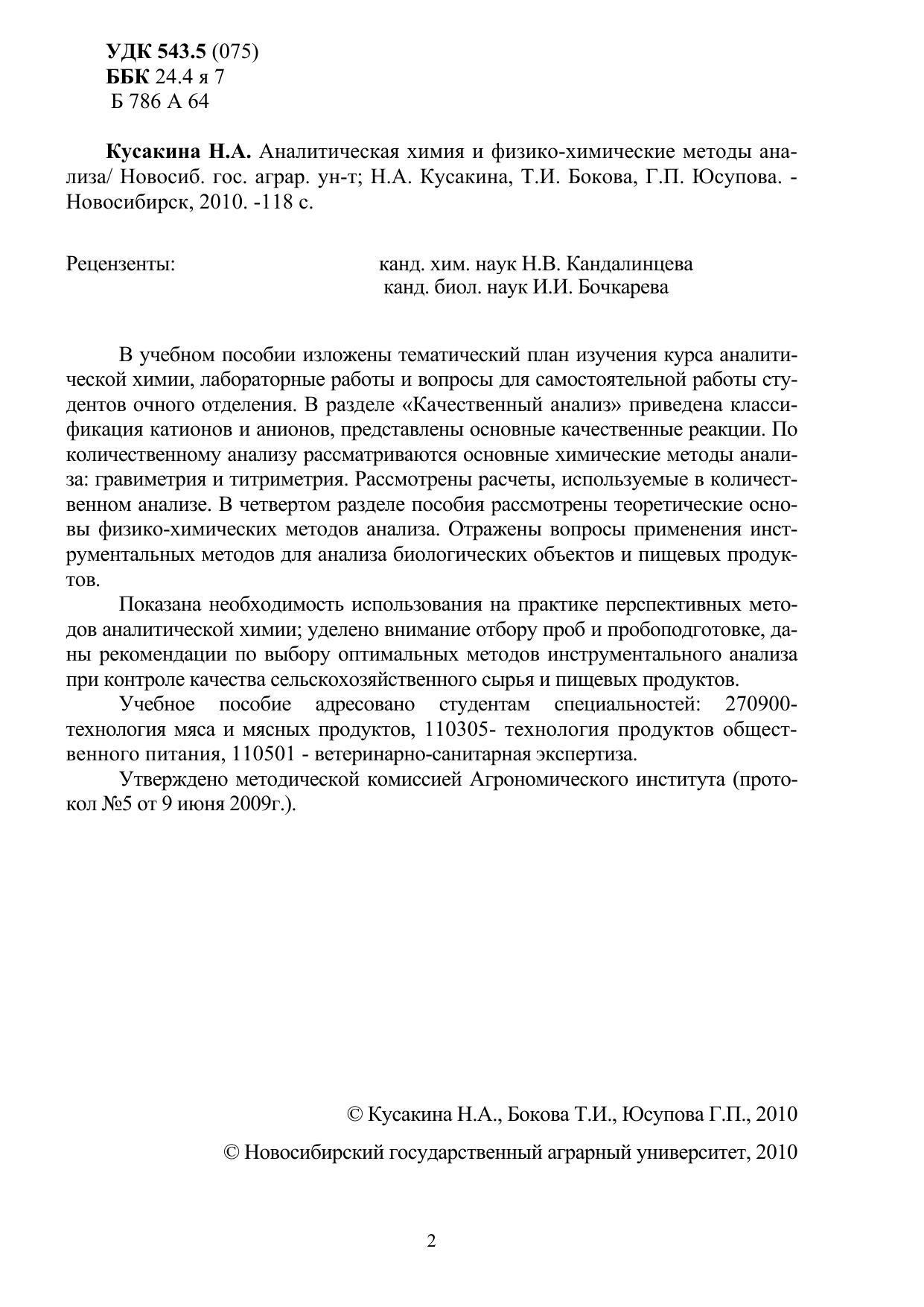 В учебном пособии изложены тематический план изучения курса аналитической химии, лабораторные работы и вопросы для самостоятельной работы студентов очного отделения. В разделе «Качественный анализ» приведена классификация катионов и анионов, представлены основные качественные реакции. По количественному анализу рассматриваются основные химические методы анализа: гравиметрия и титриметрия. Рассмотрены расчеты, используемые в количественном анализе. В четвертом разделе пособия рассмотрены теоретические основы физико-химических методов анализа. Отражены вопросы применения инструментальных методов для анализа биологических объектов и пищевых продуктов.