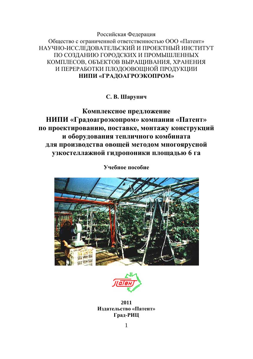 Комплексное предложение НИПИ «Градоагроэкопром» компании ООО «Патент» по проектированию, поставке, монтажу конструкций и оборудования тепличного комбината для производства овощей методом многоярусной узкостеллажной гидропоники площадью 6 га