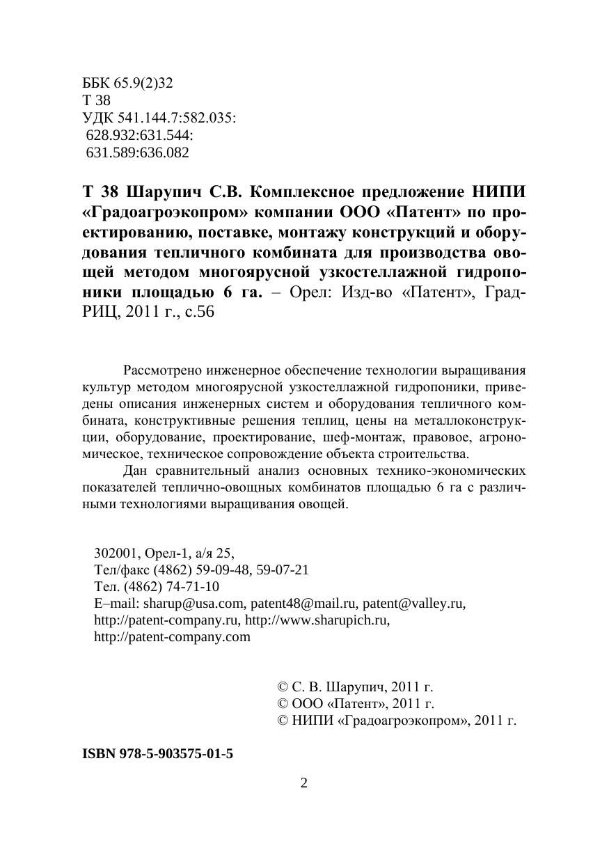 Рассмотрено инженерное обеспечение технологии выращивания культур методом многоярусной узкостеллажной гидропоники, приведены описания инженерных систем и оборудования тепличного комбината, конструктивные решения теплиц, цены на металлоконструкции, оборудование, проектирование, шеф-монтаж, правовое, агрономическое, техническое сопровождение объекта строительства.