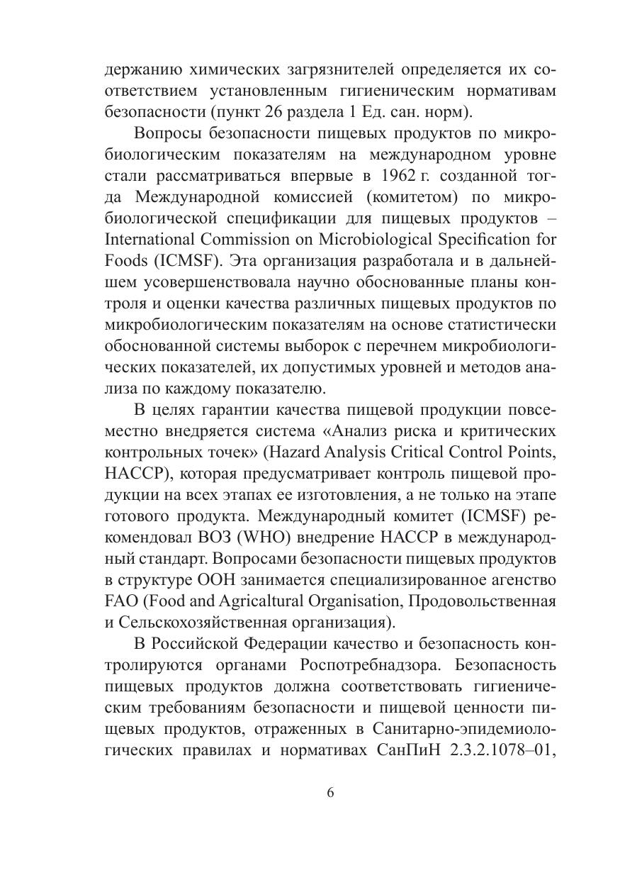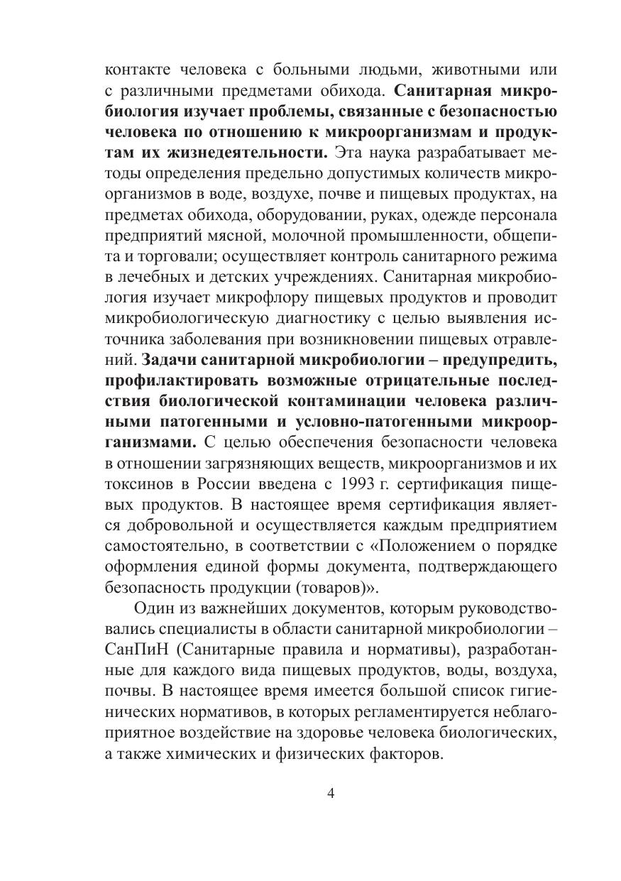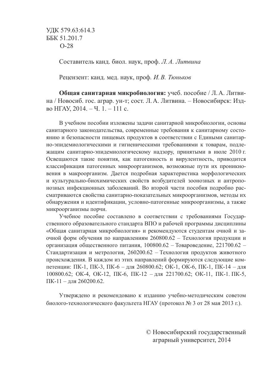 В учебном пособии изложены задачи санитарной микробиологии, основы санитарного законодательства, современные требования к санитарному состоянию и безопасности пищевых продуктов в соответствии с Едиными санитарно-эпидемиологическими и гигиеническими требованиями к товарам, подлежащим санитарно-эпидемиологическому надзору, принятыми в июле 2010 г. Освещаются такие понятия, как патогенность и вирулентность, приводится классификация патогенных микроорганизмов, возможные пути их проникновения в макроорганизм. Дается подробная характеристика морфологических и культурально-биохимических свойств возбудителей зоонозных и антропонозных инфекционных заболеваний. Во второй части пособия подробно рассматриваются свойства санитарно-показательных микроорганизмов, методы их обнаружения и идентификации, условно-патогенные микроорганизмы, а также микроорганизмы порчи. Учебное пособие составлено в соответствии с требованиями Государственного образовательного стандарта ВПО и рабочей программы дисциплины «Общая санитарная микробиология» и рекомендуются студентам очной и заочной форм обучения по направлениям 260800.62 – Технология продукции и организация общественного питания, 100800.62 – Товароведение, 221700.62 – Стандартизация и метрология, 260200.62 – Технология продуктов животного происхождения. В каждом из этих направлений формируются следующие компетенции: ПК-1, ПК-3, ПК-6 – для 260800.62, ОК-1, ОК-6, ПК-1, ПК-14 – для 100800.62, ОК-4, ОК-12, ПК-6, ПК-12 – для 221700.62, ОК-11, ПК-1. ПК-5, ПК-11 – для 260200.62