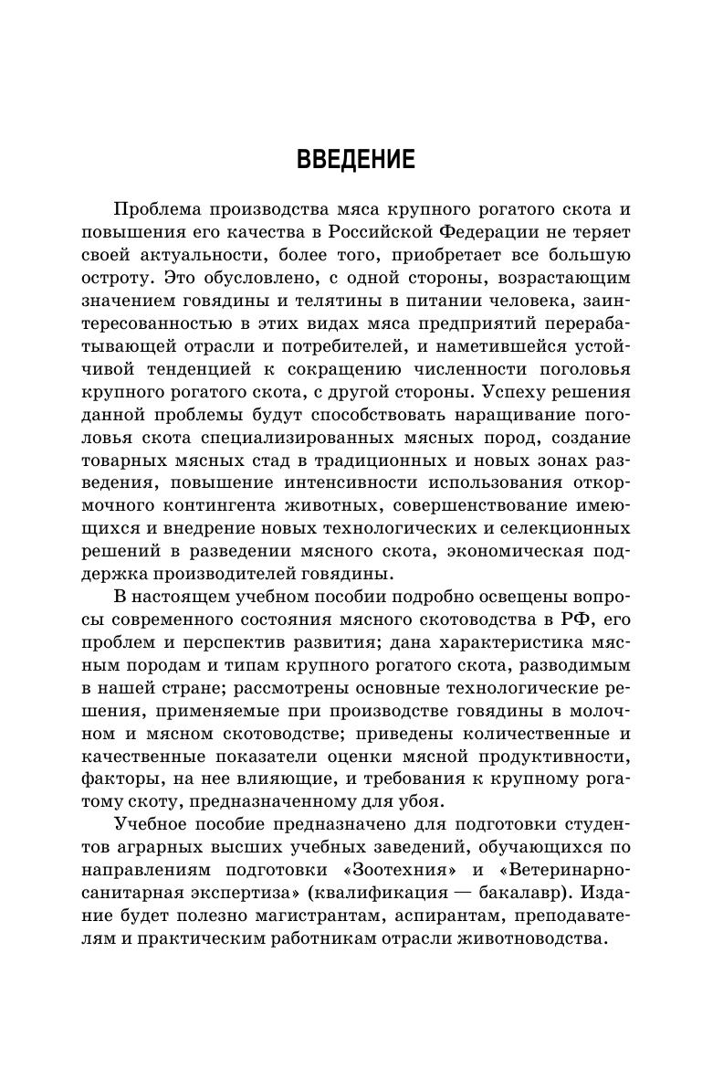 В учебном пособии освещены вопросы современного состояния мясного скотоводства в РФ, его проблем и перспектив развития; дана характеристика мясным породам и типам крупного рогатого скота, разводимым в нашей стране; рассмотрены основные технологические решения, применяемые при производстве говядины в молочном и мясном скотоводстве; приведены количественные и качественные показатели оценки мясной продуктивности, факторы, на нее влияющие, и требования к крупному рогатому скоту, предназначенному для убоя.