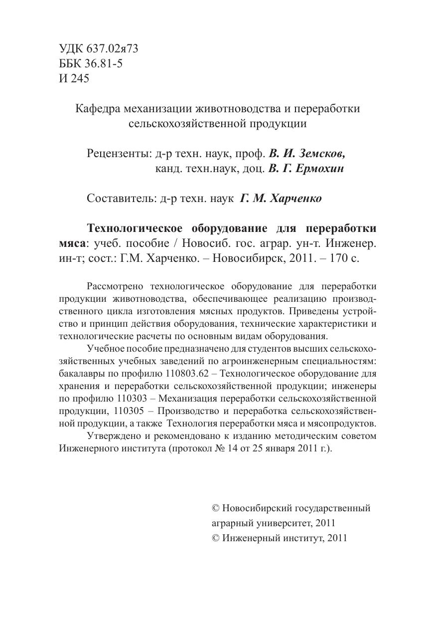 Рассмотрено технологическое оборудование для переработки продукции животноводства, обеспечивающее реализацию производственного цикла изготовления мясных продуктов. Приведены устройство и принцип действия оборудования, технические характеристики и технологические расчеты по основным видам оборудования. Учебное пособие предназначено для студентов высших сельскохозяйственных учебных заведений по агроинженерным специальностям: бакалавры по профилю 110803.62 – Технологическое оборудование для хранения и переработки сельскохозяйственной продукции, инженеры по профилю 110303 – Механизация переработки сельскохозяйственной продукции, 110305 – Производство и переработка сельскохозяйственной продукции, а также Технология переработки мяса и мясопродуктов.
