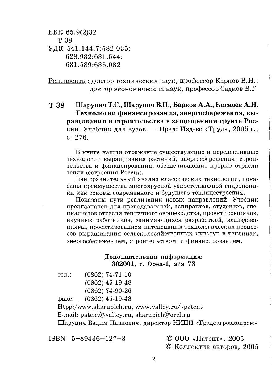 Показаны пути реализации новых направлений. Учебник предназначен для преподавателей, аспирантов, студентов, специалистов отрасли тепличного овощеводства, проектировщиков, научных работников, занимающихся разработкой, исследованиями, проектированием интенсивных технологических процессов выращивания сельскохозяйственных культур в теплицах, энергосбережением, строительством и финансированием.