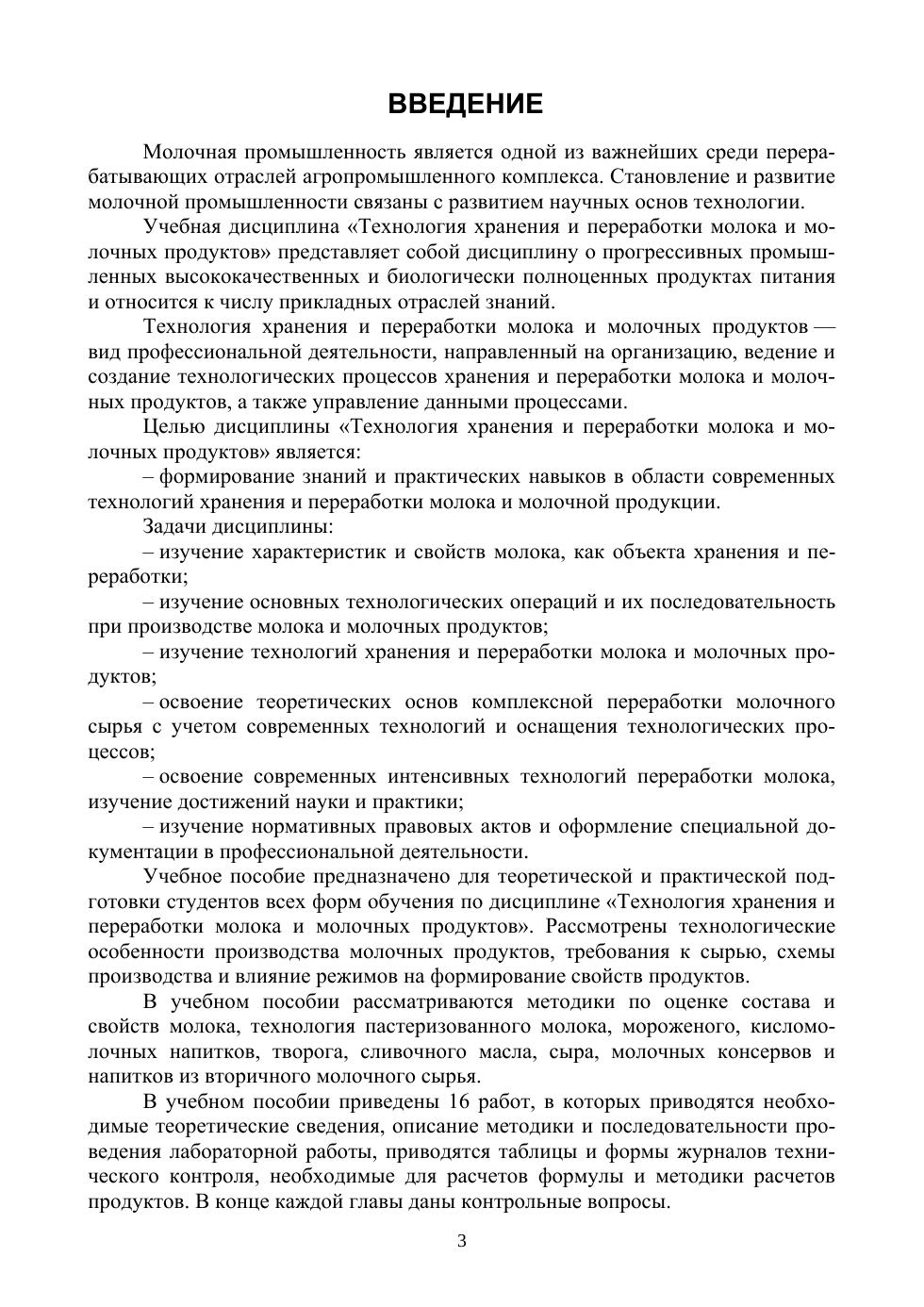 В учебном пособии рассматриваются методики по оценке состава и свойств молока, технология пастеризованного молока, мороженого, кисломолочных напитков, творога, сливочного масла, сыра, молочных консервов и напитков из вторичного молочного сырья. Всего учебное пособие содержит 16 работ , в которых приводятся необходимые теоретические сведения, описание методики и последовательности проведения лабораторной работы, приводятся таблицы и формы журналов технического контроля, необходимые для расчетов формулы и методики расчетов продуктов. В конце каждой главы даны контрольные вопросы. Учебное пособие по дисциплине «Технология хранения и переработки молока и молочных продуктов» составлены в соответствии с Федеральным государственным образовательным стандартом высшего образования и действующим учебным планом и предназначено для студентов очной и заочной форм обучения направления подготовки «Технология производства и переработки сельскохозяйственной продукции», уровень подготовки – бакалавриат.