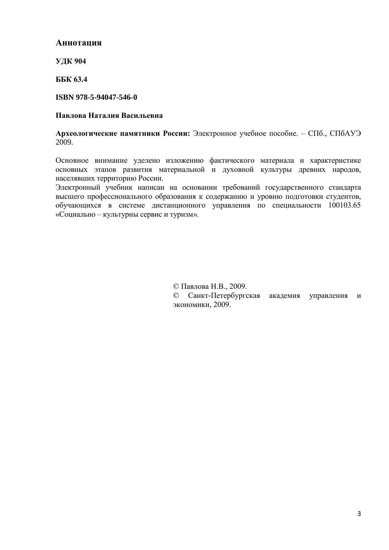 Основное внимание уделено изложению фактического материала и характеристике основных этапов развития материальной и духовной культуры древних народов, населявших территорию России. Электронный учебник написан на основании требований государственного стандарта высшего профессионального образования к содержанию и уровню подготовки студентов, обучающихся в системе дистанционного управления по специальности 100103.65 «Социально – культурны сервис и туризм». Электронное учебное пособие для дистанционного обучения