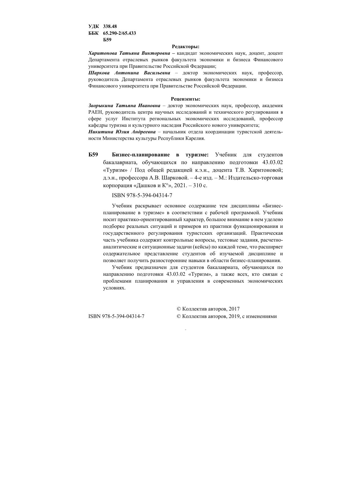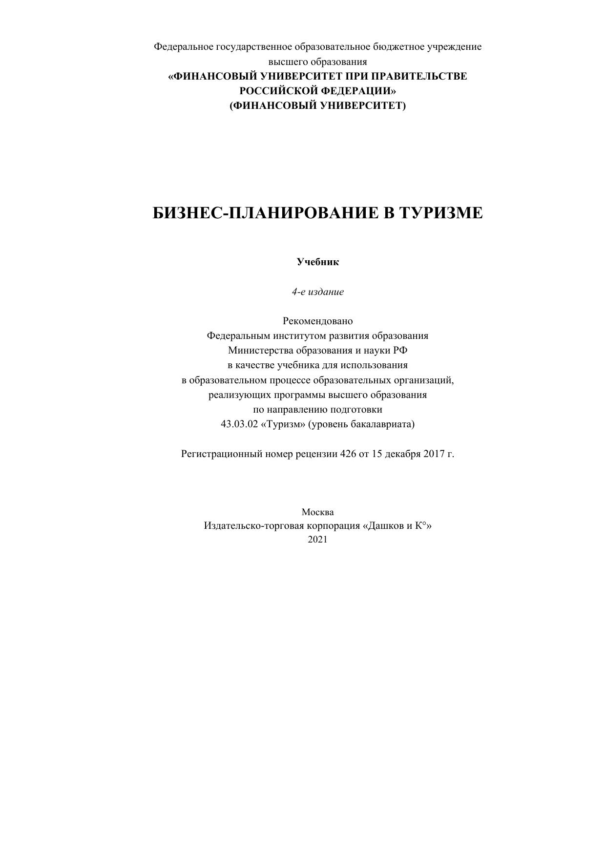Учебник раскрывает основное содержание тем дисциплины «Бизнес-планирование в туризме» в соответствии с рабочей программой. Учебник носит практико-ориентированный характер, большое внимание в нем уделено подборке реальных ситуаций и примеров из практики функционирования и государственного регулирования туристских организаций. Практическая часть учебника содержит контрольные вопросы, тестовые задания, расчетно-аналитические и ситуационные задачи (кейсы) по каждой теме, что расширяет содержательное представление студентов об изучаемой дисциплине и позволяет получить разносторонние навыки в области бизнес-планирования. Учебник предназначен для студентов бакалавриата, обучающихся по направлению подготовки 43.03.02 «Туризм», а также всех, кто связан с проблемами планирования и управления в современных экономических условиях.