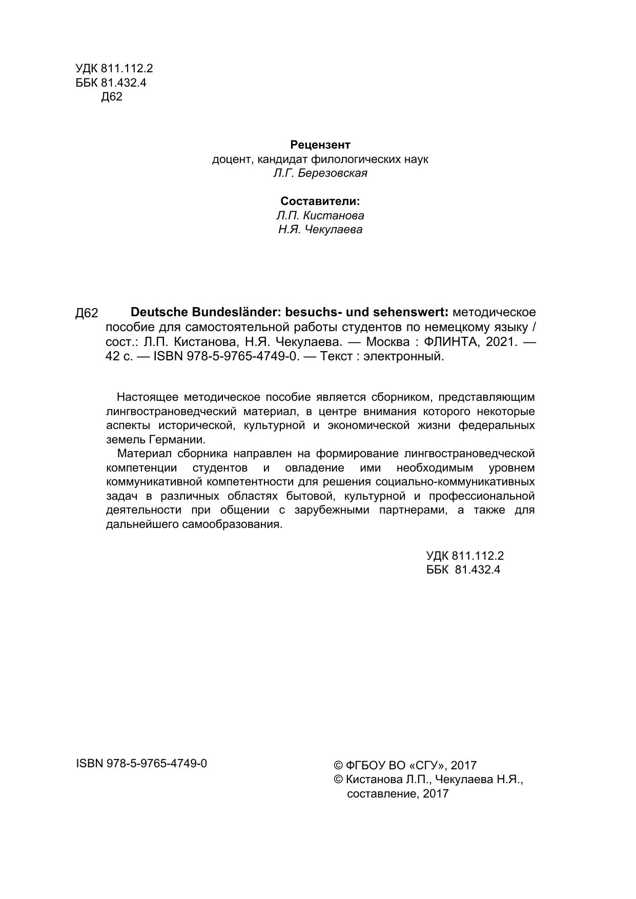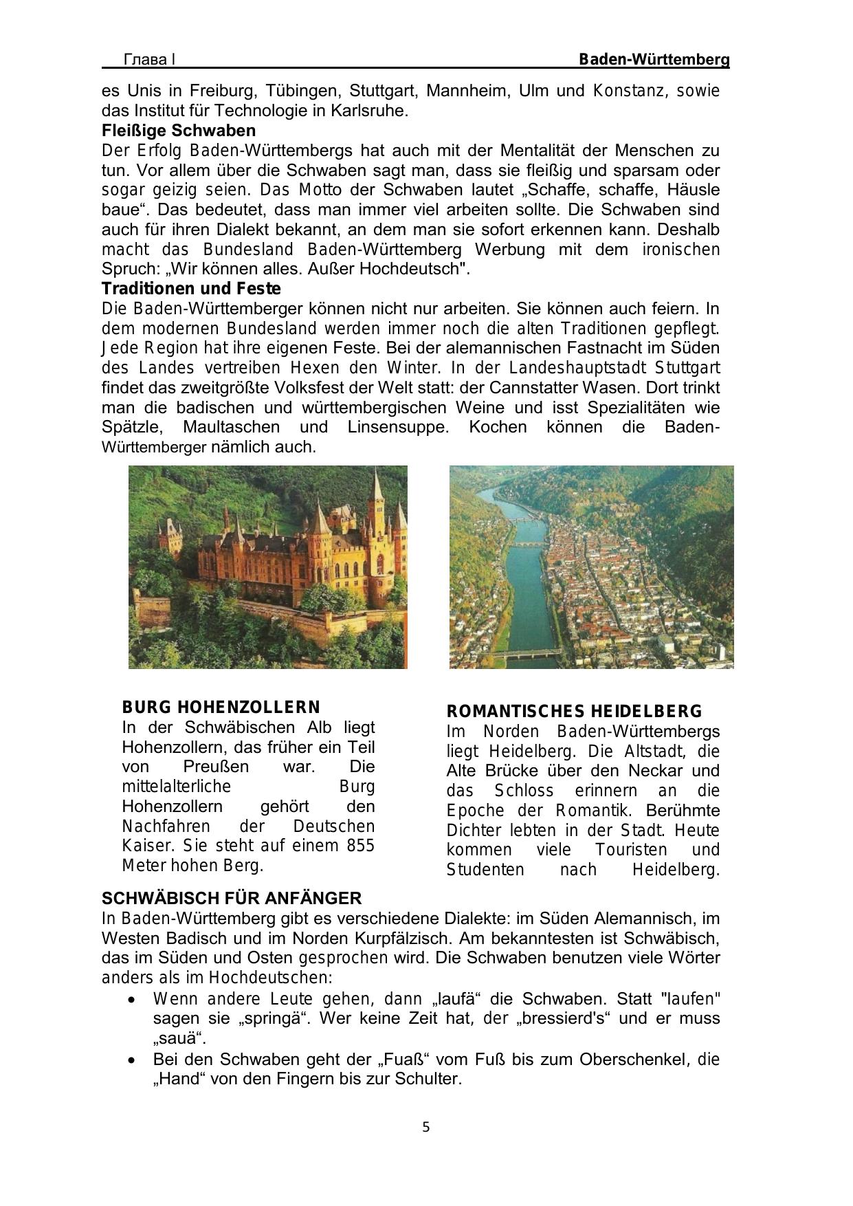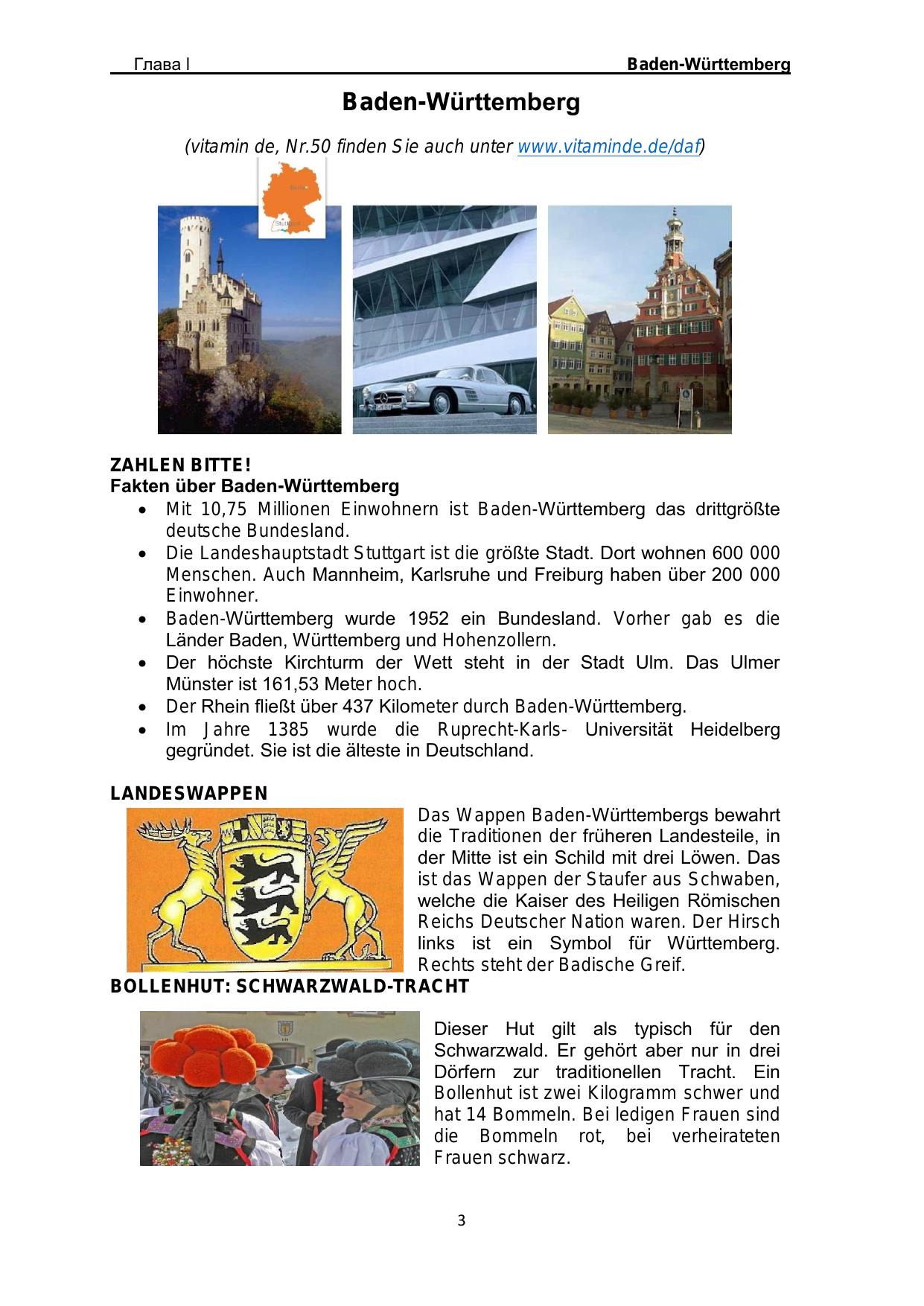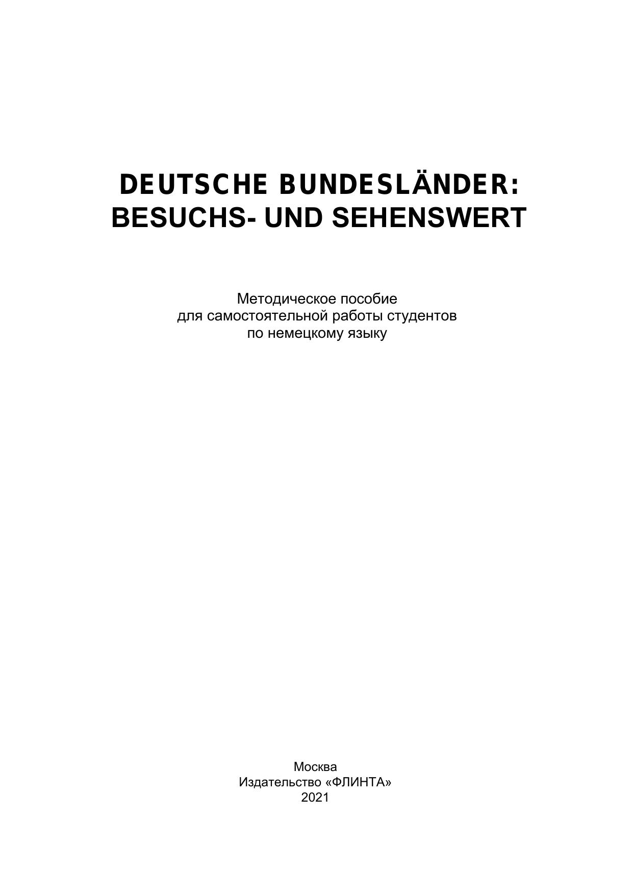 Настоящее методическое пособие является сборником, представляющим лингвострановедческий материал, в центре внимания которого некоторые аспекты исторической, культурной и экономической жизни федеральных земель Германии. Материал сборника направлен на формирование лингвострановедческой компетенции студентов и овладение ими необходимым уровнем коммуникативной компетентности для решения социально-коммуникативных задач в различных областях бытовой, культурной и профессиональной деятельности при общении с зарубежными партнерами, а также для дальнейшего самообразования.