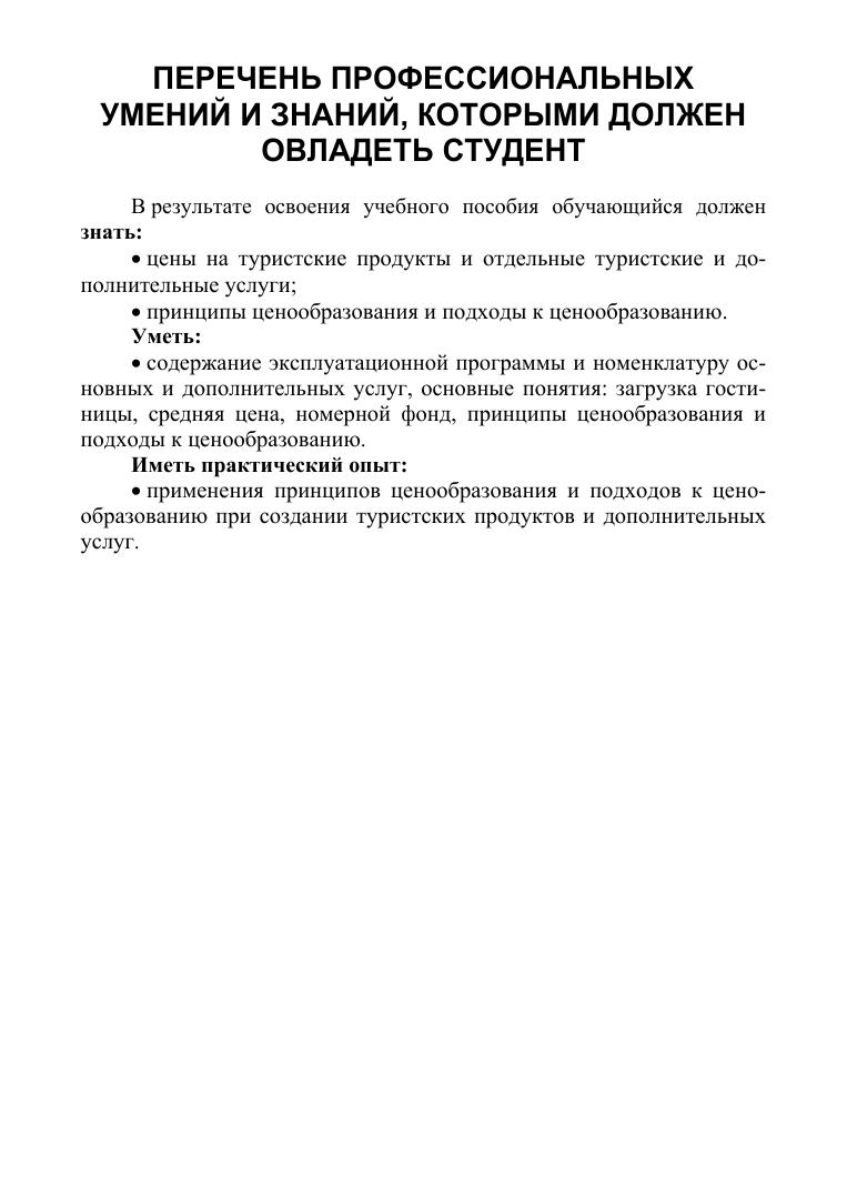 В учебном пособии рассмотрены вопросы ценообразования как в целом, так и применительно к индустрии туризма, размещения и питания. По темам и разделам представлены контрольно-измерительные материалы, в том числе задачи по определению цен на туры, стоимости размещение и питания. Соответствует современным требованиям Федерального государственного образовательного стандарта среднего профессионального образования и профессиональным квалификационным требованиям.
