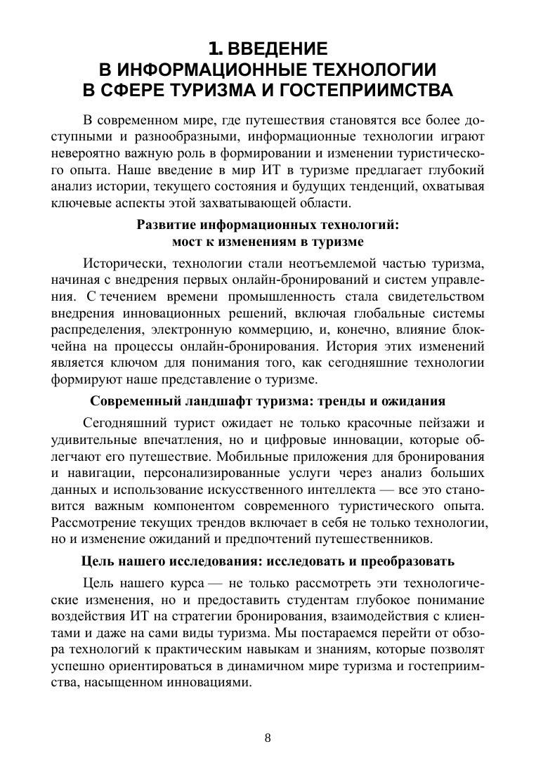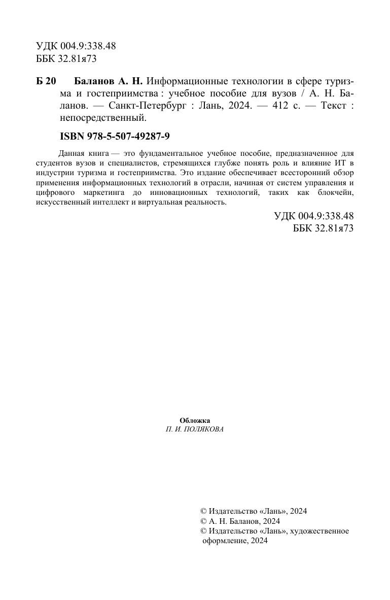 Данная книга — это фундаментальное учебное пособие, предназначенное для студентов вузов и специалистов, стремящихся глубже понять роль и влияние ИТ в индустрии туризма и гостеприимства. Это издание обеспечивает всесторонний обзор применения информационных технологий в отрасли, начиная от систем управления и цифрового маркетинга до инновационных технологий, таких как блокчейн, искусственный интеллект и виртуальная реальность.